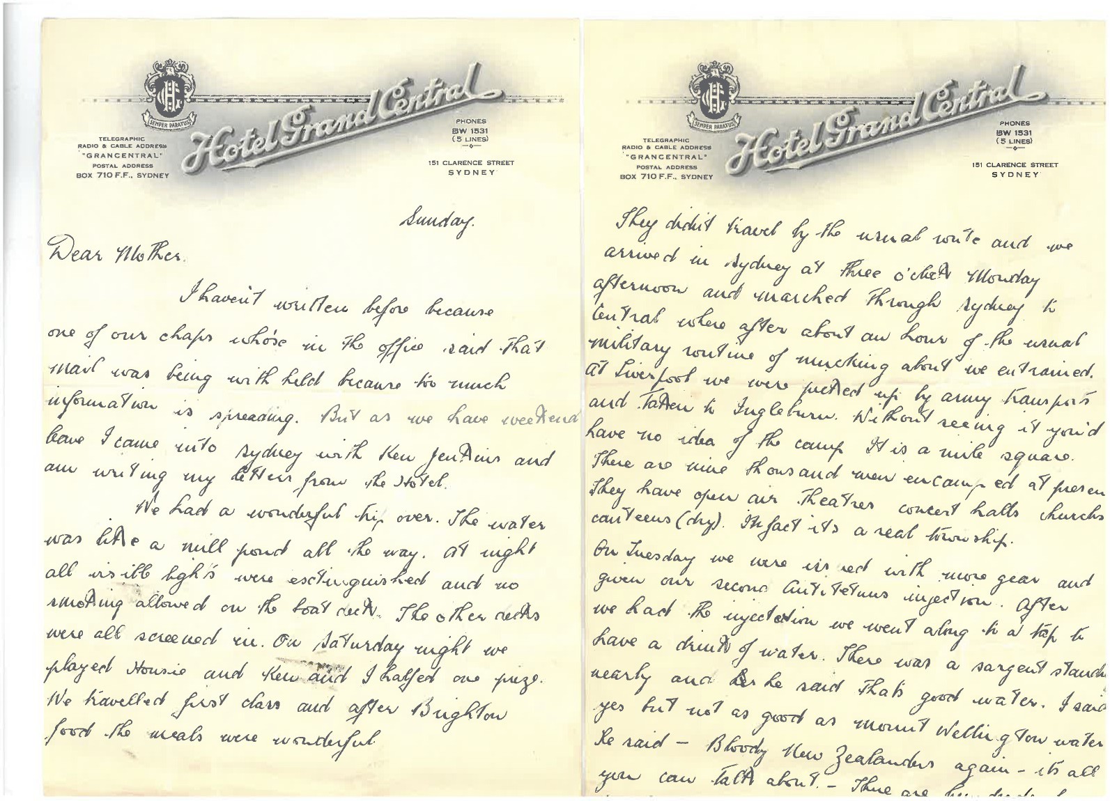 I haven’t written before because one of our chaps who’s in the office said that mail was being held because too much information is spreading. But as we have weekend leave I came in to Sydney with Ken Jenkins and am writing my letters from the Hotel.