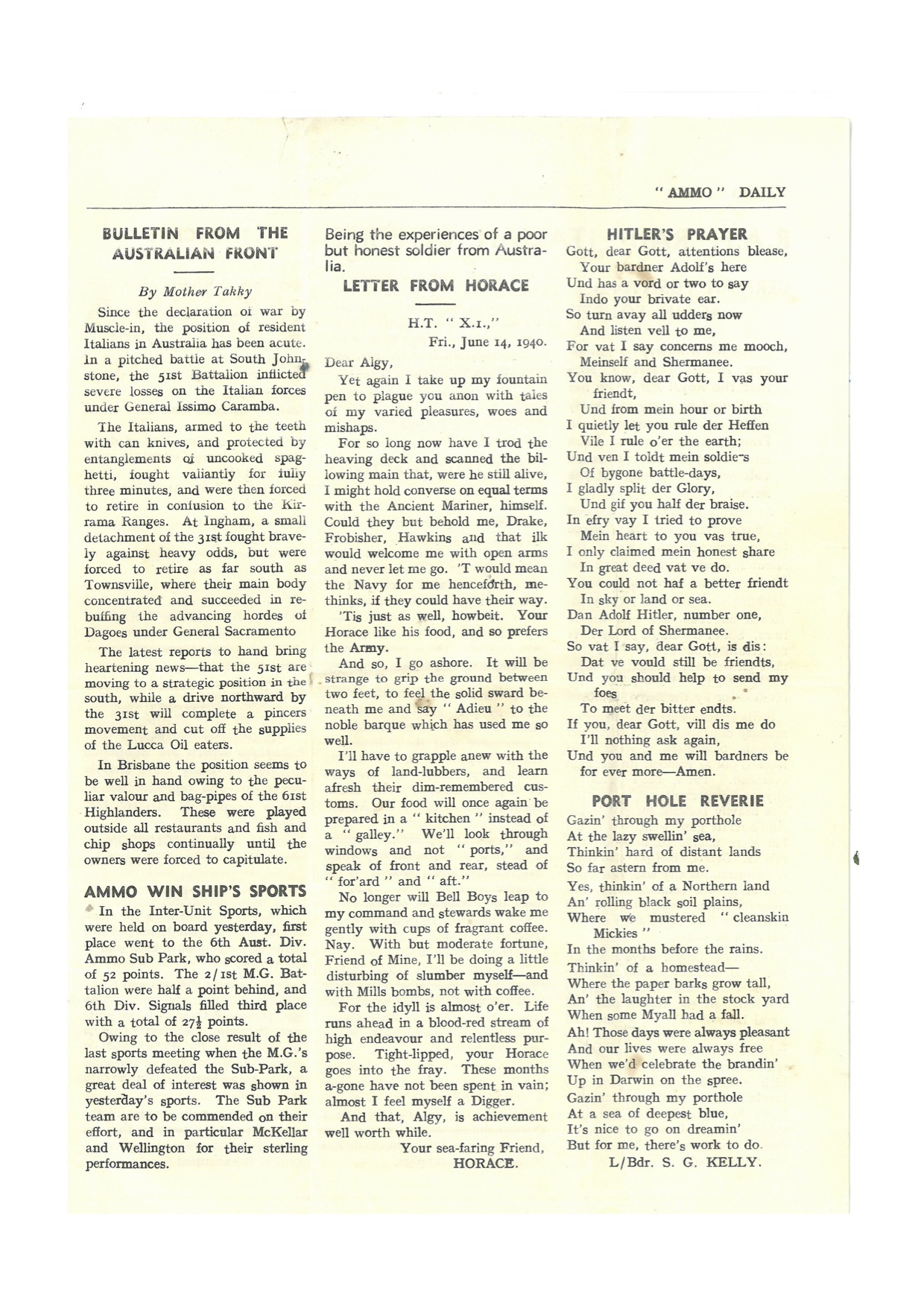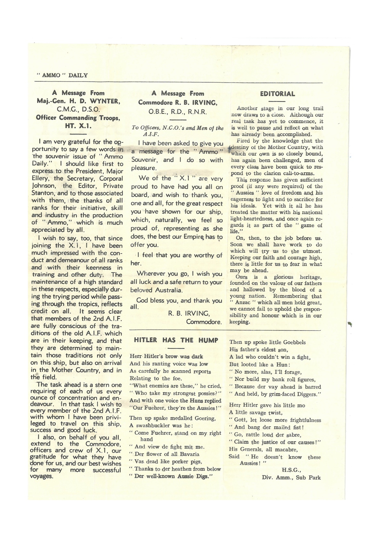 “Ammo Daily” was published often – though not daily – on board troopship’X1′ (i.e. the Queen Mary). Dad kept the final issue – volume 1, no. 37 – as a souvenir: