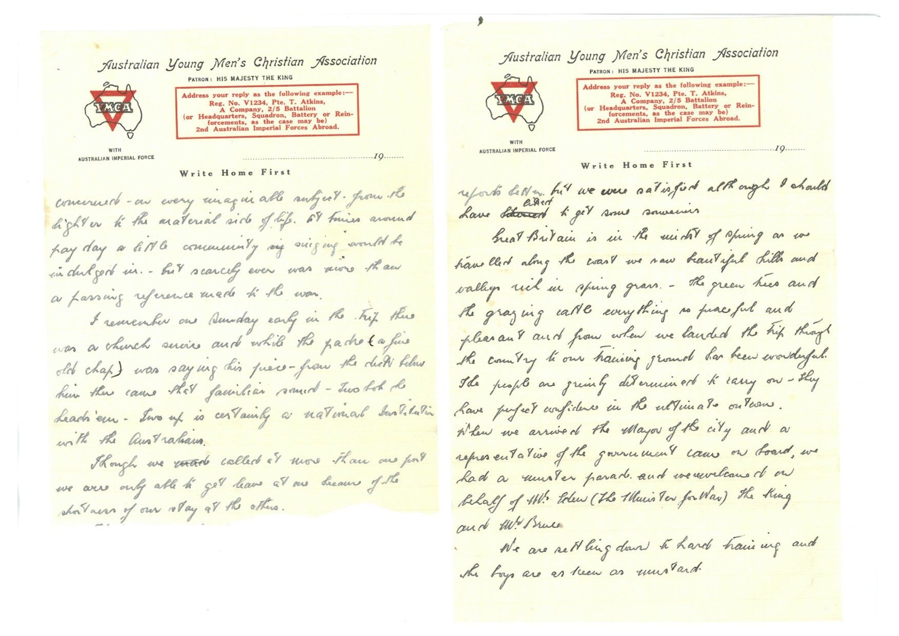 Letterhead: YMCA – including instructions on how to address mail, and the invocation to Write Home First