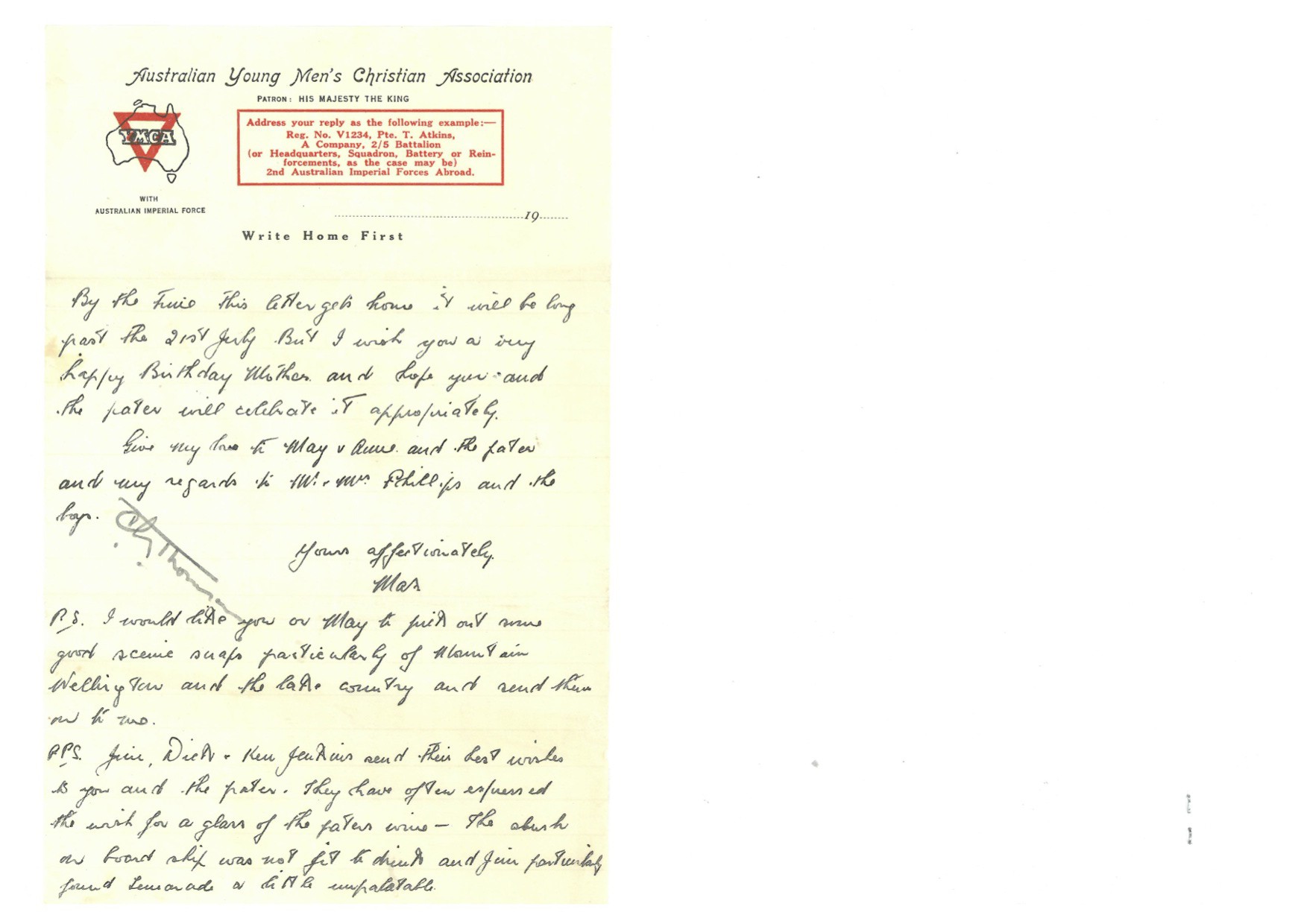 By the time this letter gets home it will be long past the 21st July but I wish you a very happy birthday Mother and hope you and the pater will celebrate it appropriately.