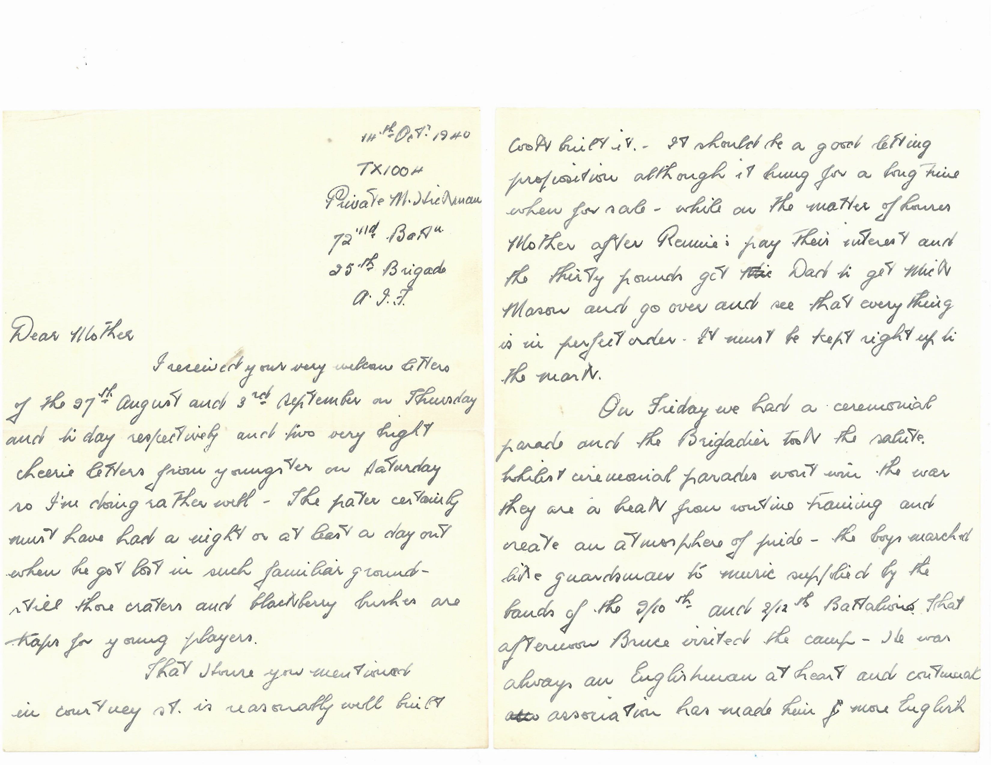 On Friday we had a ceremonial parade and the Brigadier took the salute. Whilest ceremonial parades won’t win the war they are a break from routine training and create an atmosphere of pride – the boys marched like guardsmen to music supplied by the bands of the 2/10th and 2/12th Battalions. That afternoon Bruce visited the camp. He was always an Englishman at heart and continual association has made him more English than the English themselves. The cult of always having hands in the coat pockets with the thumbs out in gunmen fashion is an exemplification of English public life.