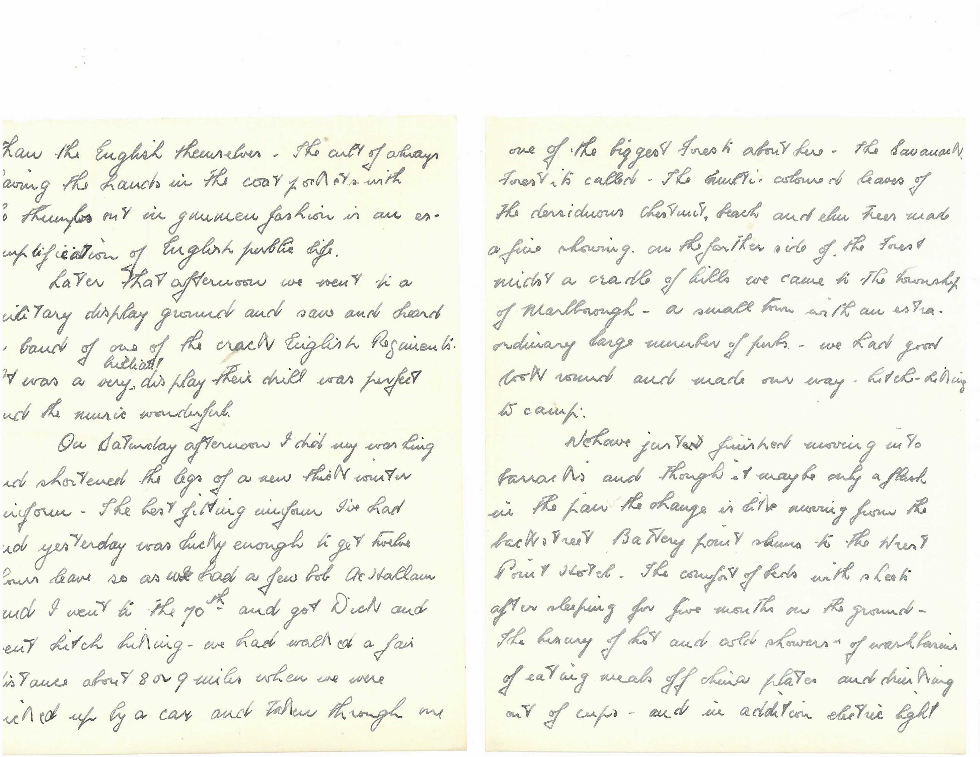 On Saturday afternoon I did my washing and shortened the legs of a new thick winter uniform – the best fitting uniform I’ve had and yesterday was lucky enough to get twelve hours leave so as we had a few bob Ac Hallam and I went to the 70th and got Dick and went hitch hiking. We had walked a fair distance about 8 or 9 miles when we were picked up by a car and taken through one of the biggest forests about here – the Savanack [Savernake] Forest it’s called. The multi-coloured leaves of the deciduous chestnut, beech and elm trees made a fine showing on the farther side of the Forest midst a cradle of hills we came to the township of Marlborough – a small town with an extra-ordinary large number of pubs. We had a good look round and made our way hitch hiking to camp.
