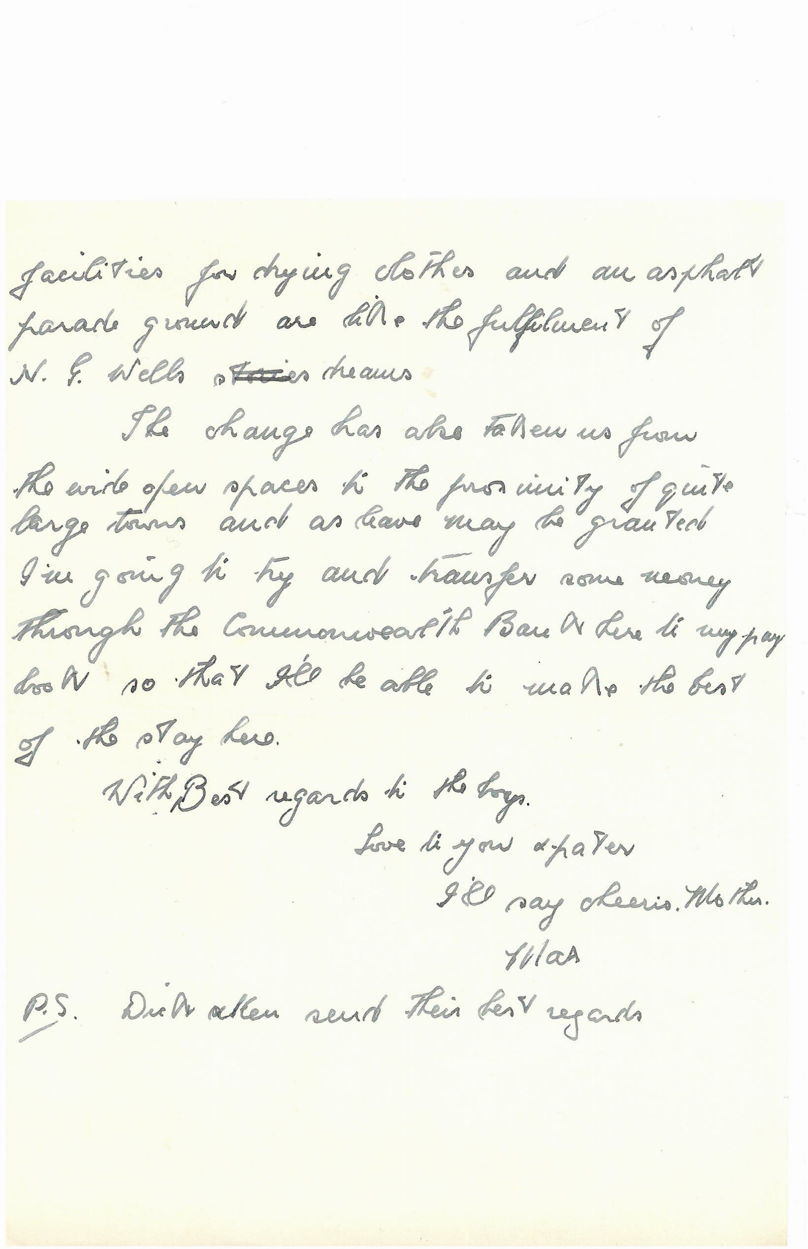 It seems Dad might have written this letter over several days -because he’s clearly at the barracks already, and according to The Footsoldiers (p17) On October 16 the battalion moved out, all the transport was brigaded and moved by road. On arrival at our new quarters at Colchester, 39 miles north-east of London and only 15 miles from the coast, we all were agreeably surprised to find our new home Cherry Tree Barracks modern and comfortable. There was a vast hall to seat the whole battalion, a large main kitchen, with all modern facilities and we had the use of hot and cold showers. However few of us were happy to see the asphalt parade ground…