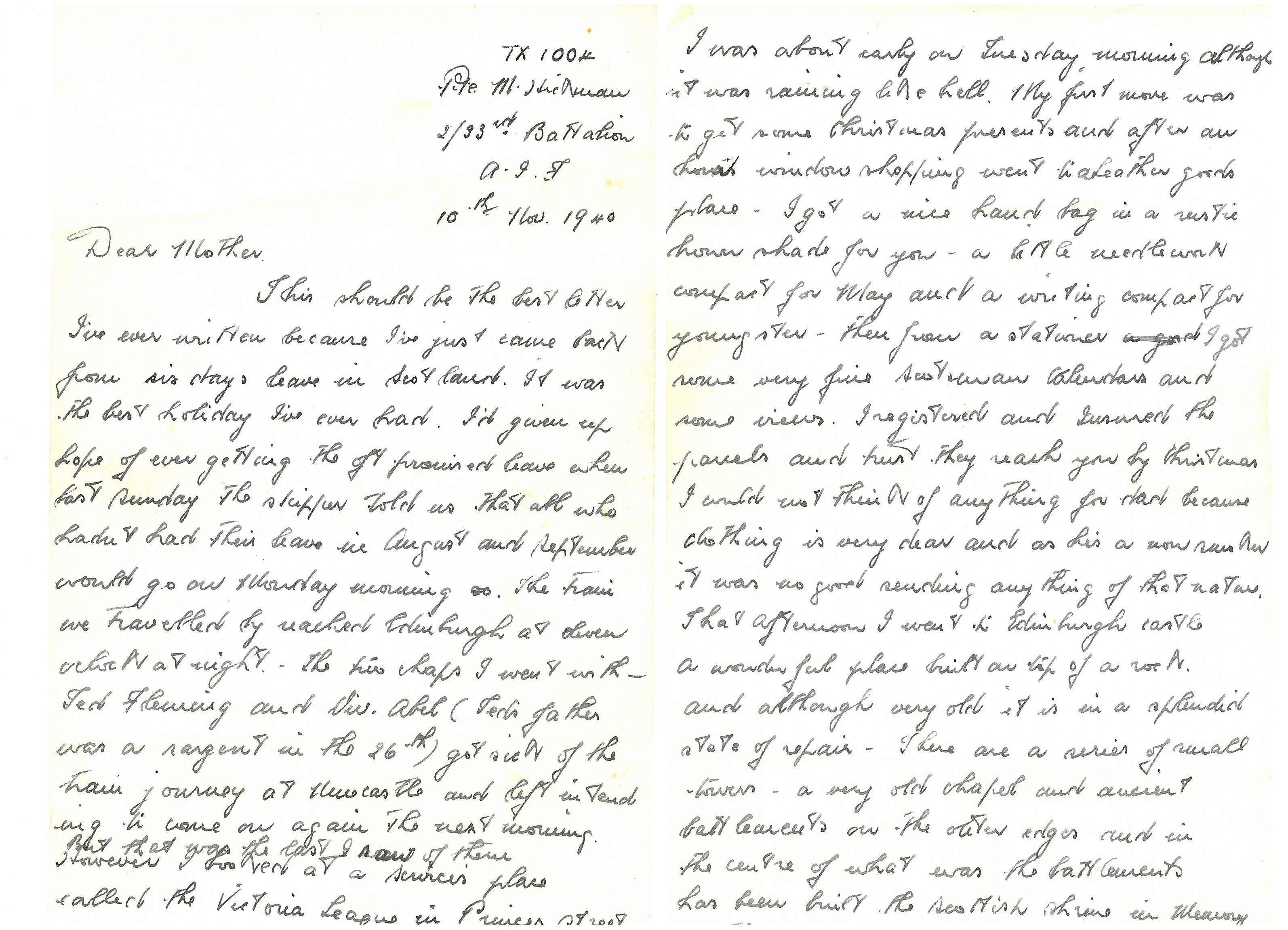 This should be the best letter I’ve ever written because I’ve just come back from six days’ leave in Scotland. It was the best holiday I’ve ever had. I’d given up hope of ever getting the oft promised leave when last Sunday the skipper told us that all who hadn’t had their leave in August and September would go on Monday morning. The train we travelled by reached Edinburgh at eleven o’clock at night. The two chaps I went with – Ted Fleming and Viv Abel (Ted’s father was a sergeant in the 26th) got sick of the train journey at Newcastle and left intending to come on again the next morning but that was the last I saw of them.