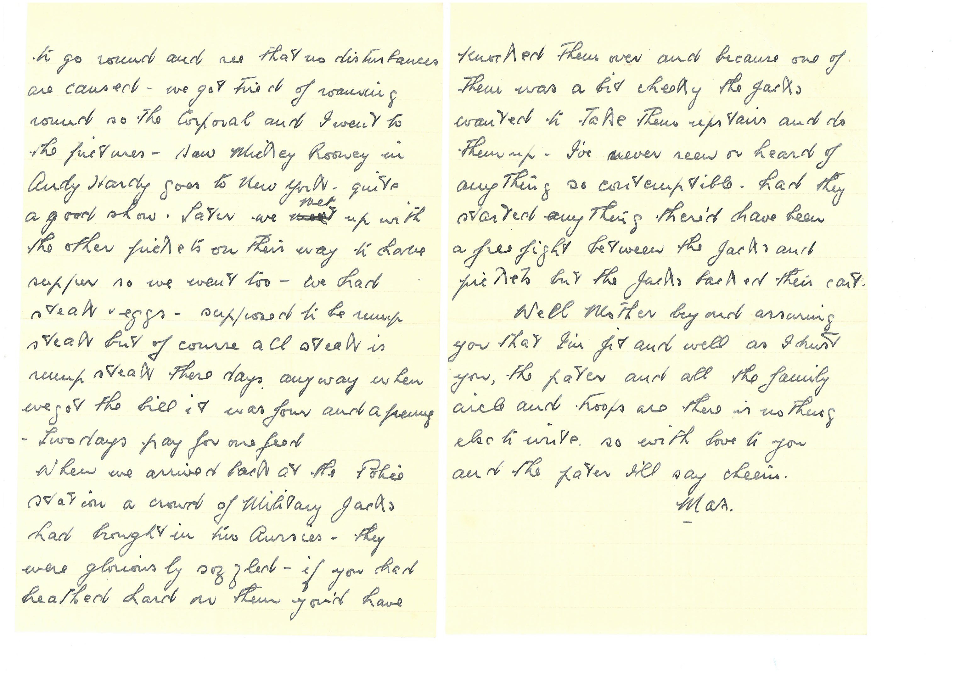I was on Town picket the other day – Saturday – the idea being to go round and see that no disturbances are caused – we got tired of roaming round so the Corporal and I went to the pictures – saw Mickey Rooney in Andy Hardy Goes to New York – quite a good show. Later we met up with the other pickets on their way to have supper so we went too – we had steak & eggs – supposed to be rump steak but of course all steak is rump steak these days. Anyway when we got the bill it was four and a penny – two days’ pay for one feed.