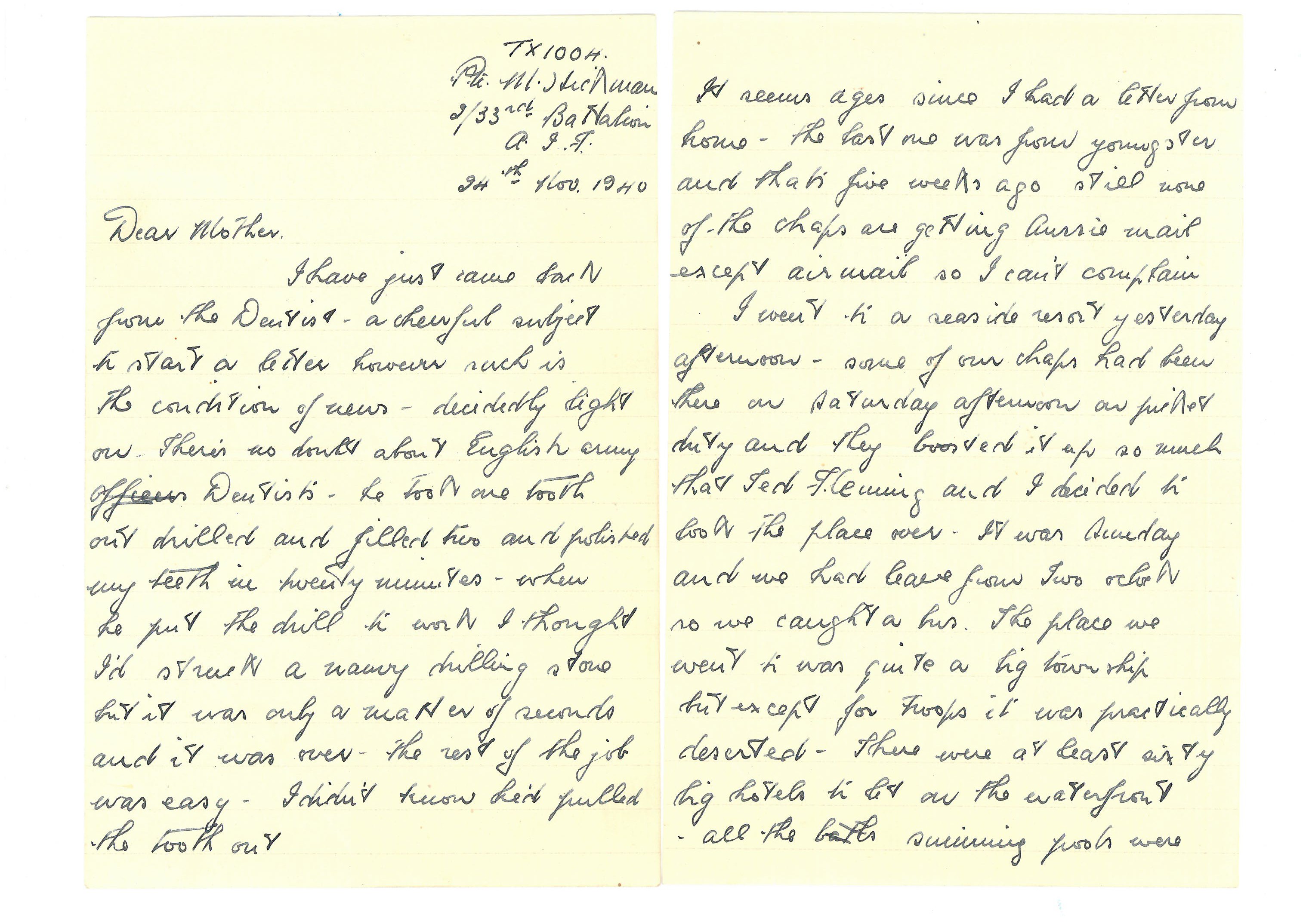 I have just come back from the Dentist – a cheerful subject to start a letter however such is the condition of news – decidedly light on. There’s no doubt about English army dentists – he took one tooth out, drilled and filled two and polished my teeth in twenty minutes – when he put the drill to work I thought I’d struck a navy (?) drilling stone but it was only a matter of seconds and it was over – the rest of the job was easy – I didn’t know he’d pulled the tooth out.