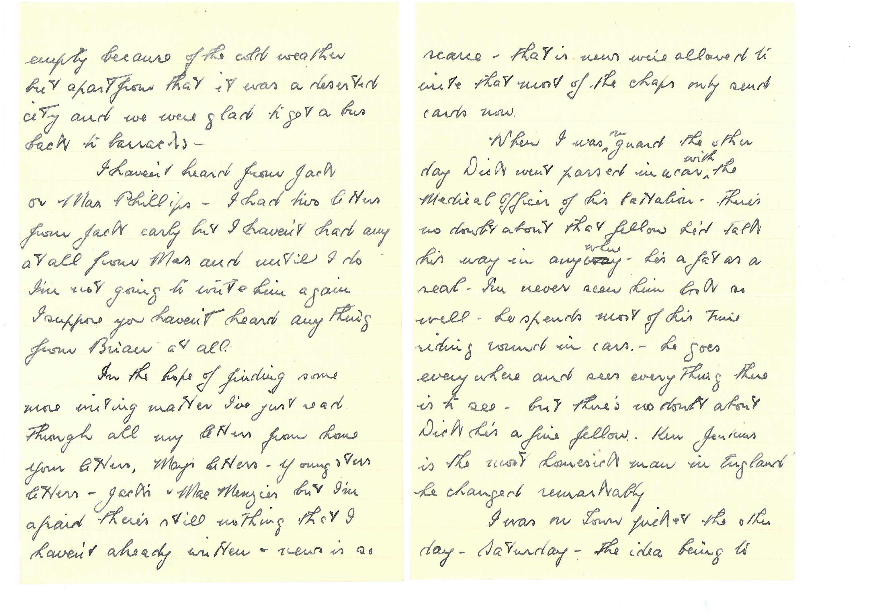 When I was on guard the other day Dick [Schultz] went past with the Medical Officer of his battalion – there’s no doubt about that fellow he’d talk his way in anywhere – he’s as fat as a seal. I’ve never seen him look as well – he spends most of his time riding around in cars – he goes everywhere and sees everything there is to see – but there’s no doubt about Dick he’s a fine fellow. Ken Jenkins is the most homesick man in England – he’s changed remarkably.