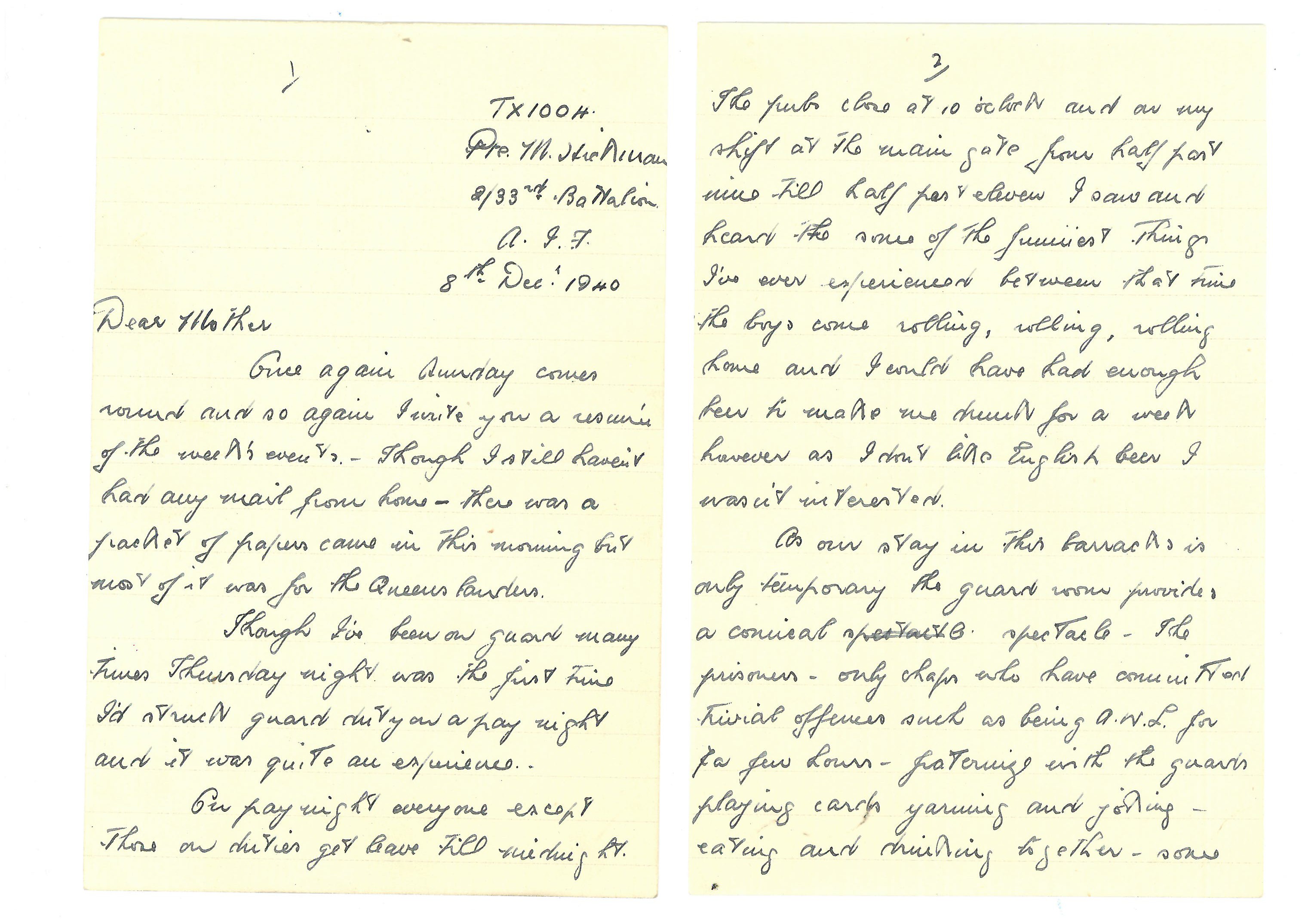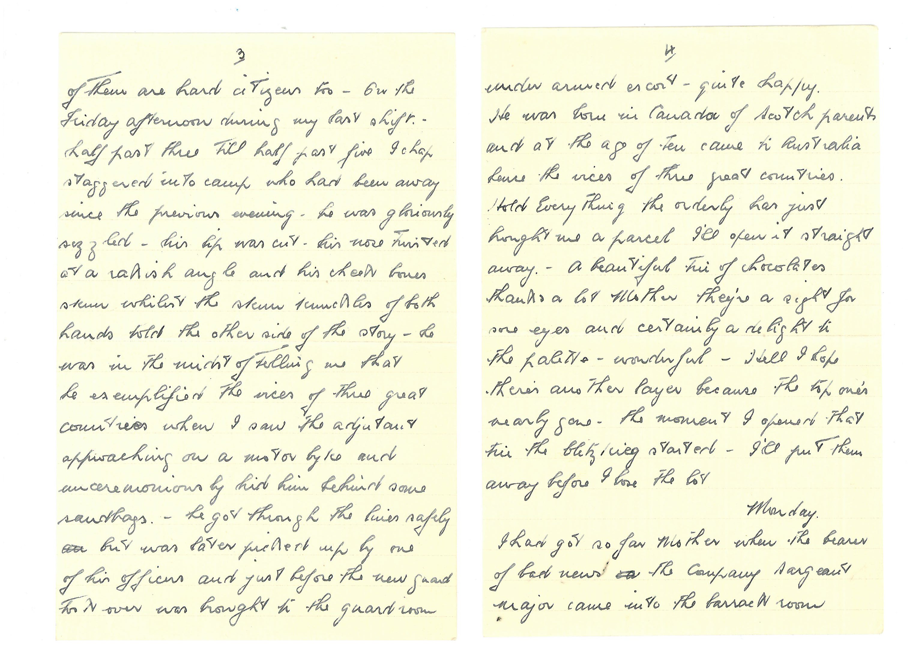 As our stay in this barracks is only temporary the guard room provides a comical spectacle. The prisoners – only chaps who have committed trivial offences such as being AWL for a few hours – fraternize with the guards playing cards, yarning and joking – eating and drinking together – some of them are hard citizens too. On the Friday afternoon during my last shift – half past three till half past five – one chap staggered into camp who had been away since the previous evening. He was gloriously sozzled – his lip was cut – his nose twisted at a rakish angle and his cheek bones skun whilst the skun knuckles of both hands told the other side of the story – he was in the midst of telling me that he exemplified the vices of three great countries when I saw the adjutant approaching on a motor byke (sic) and unceremoniously hid him behind some sandbags. He got through the lines safely but was later picked up by one of his officers and just before the new guard took over was brought to the guard room under armed escort – quite happy. He was born in Canada of Scotch parents and at the age of ten came to Australia hence the vices of three great countries. Hold everything the orderly has just brought me a parcel. I’ll open it straight away. A beautiful tin of chocolates. Thanks a lot Mother – they’re a sight for sore eyes and certainly a delight to the palette – wonderful – Hell I hope there’s another layer because the top one’s nearly gone. The moment I opened that tin the blitzkrieg started – I’ll put them away before I lose the lot.