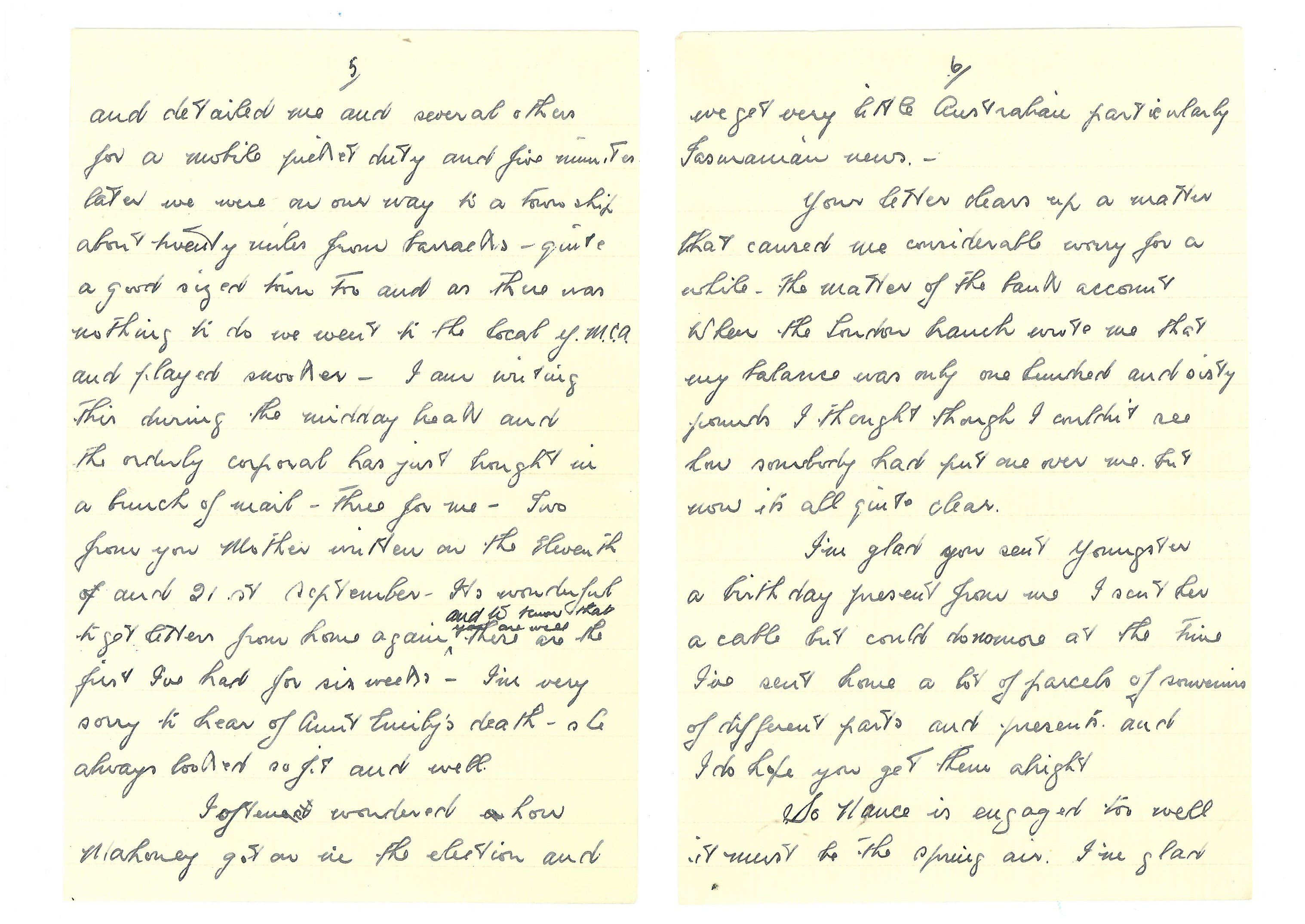 I had got so far Mother when the bearer of bad news the Company Sergeant Major came into the barrack room and detailed me and several others for a mobile picket duty and five minutes later we were on our way to a township about twenty miles from barracks – quite a good sized town too and as there was nothing to do we went to the local YMCA and played snooker – I am writing this during the midday break and the orderly corporal has just brought in a bunch of mail – three for me – two from you Mother written on the eleventh and 21st September. It’s wonderful to get letters from home again and to know that you are well. These are the first I’ve had for six weeks. I’m very sorry to hear of Aunt Emily’s death – she always looked so fit and well.