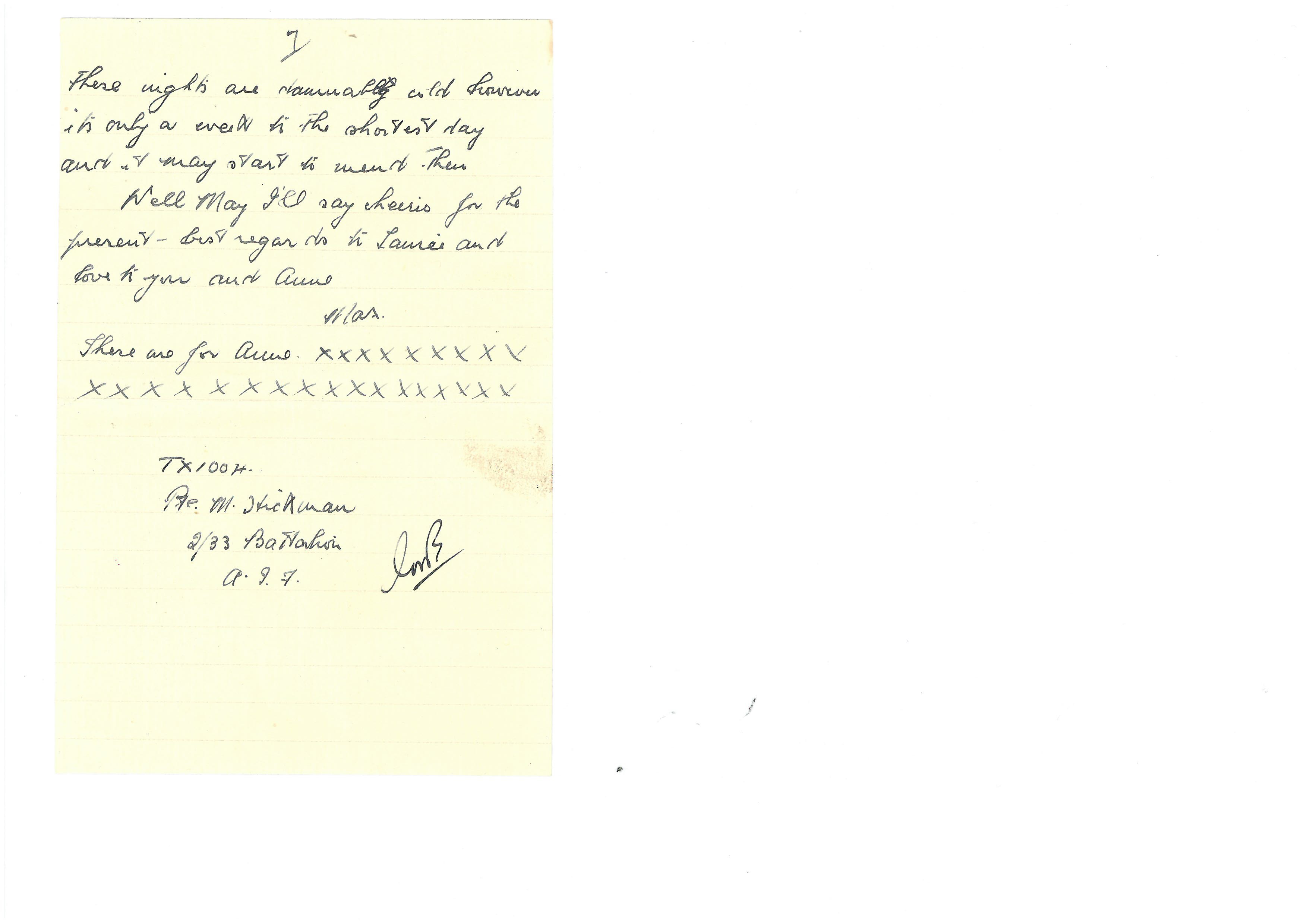 The weather is terribly cold here now and the days have less than eight hours of daylight – guard duties these nights are damnably cold however it’s only a week to the shortest day and it may start to mend then. Well May I’ll say cheerio for the present – best regards to Laurie and love to you and Anne