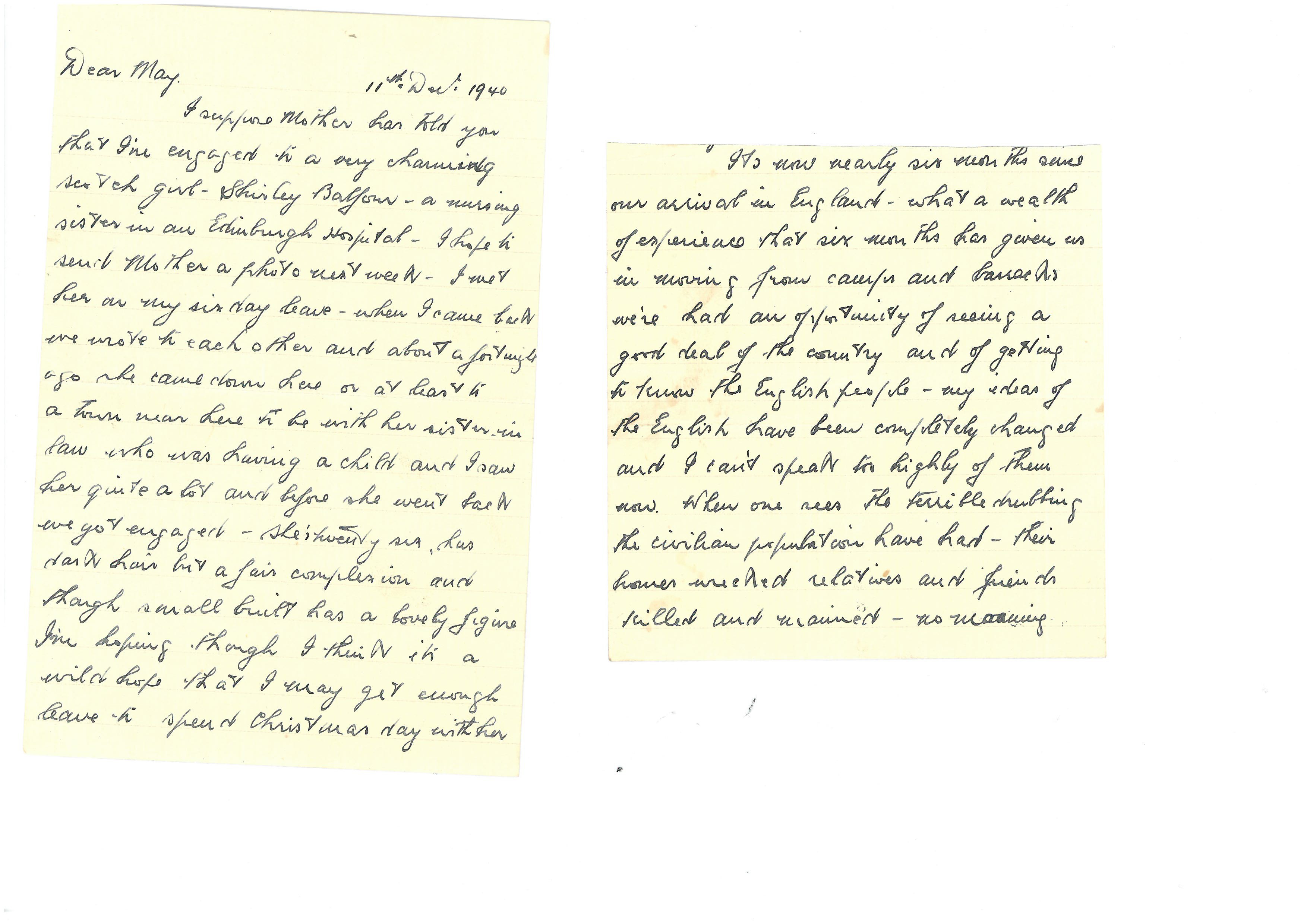 I suppose Mother has told you that I’m engaged to a very charming Scotch girl – Shirley Balfour – a nursing sister in an Edinburgh hospital. I hope to send Mother a photo next week – I met her on my six day leave. When I came back we wrote to each other and about a fortnight ago she came down here or at least to a town near here to be with her sister in law who was having a child and I saw her quite a lot and before she went back we got engaged – She’s twenty six, has dark brown hair but a fair complexion and though small built has a lovely figure. I’m hoping though I think it’s a wild hope that I may get enough leave to spend Christmas Day with her….