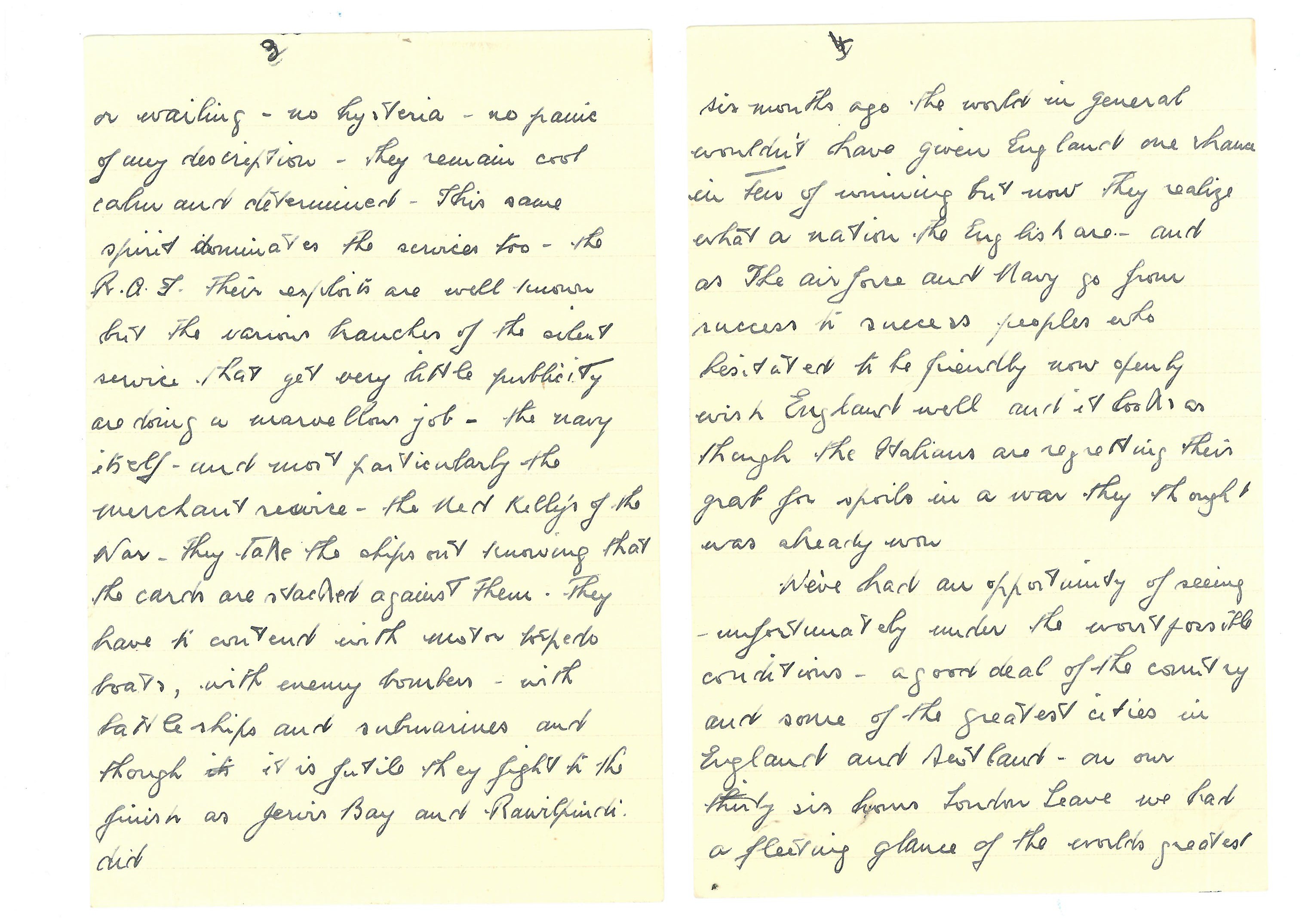 It’s now nearly six months since our arrival in England. What a wealth of experience that six months has given us: in moving from camps and barracks we’ve had an opportunity of seeing a good deal of the country and of getting to know the English people. My ideas of the English have been completely changed and I can’t speak too highly of them now. When one sees the terrible drubbing the civilian population have had – their homes wrecked, relatives and friends killed and maimed – no moaning or wailing – no hysteria – no panic of any description – they remain cool, calm and determined. This same spirit dominates the services too – the RAF – their exploits are well known but the various branches of the silent service that get very little publicity are doing a marvellous job – the navy itself – and most particularly the merchant service – the Ned Kelly’s of the war – they take the ships out knowing that the cards are stacked against them – they have to contend with motor torpedo boats, with enemy bombers, with battleships and submarines and though it is futile they fight to the finish as Jervis Bay and Rawalpindi did.