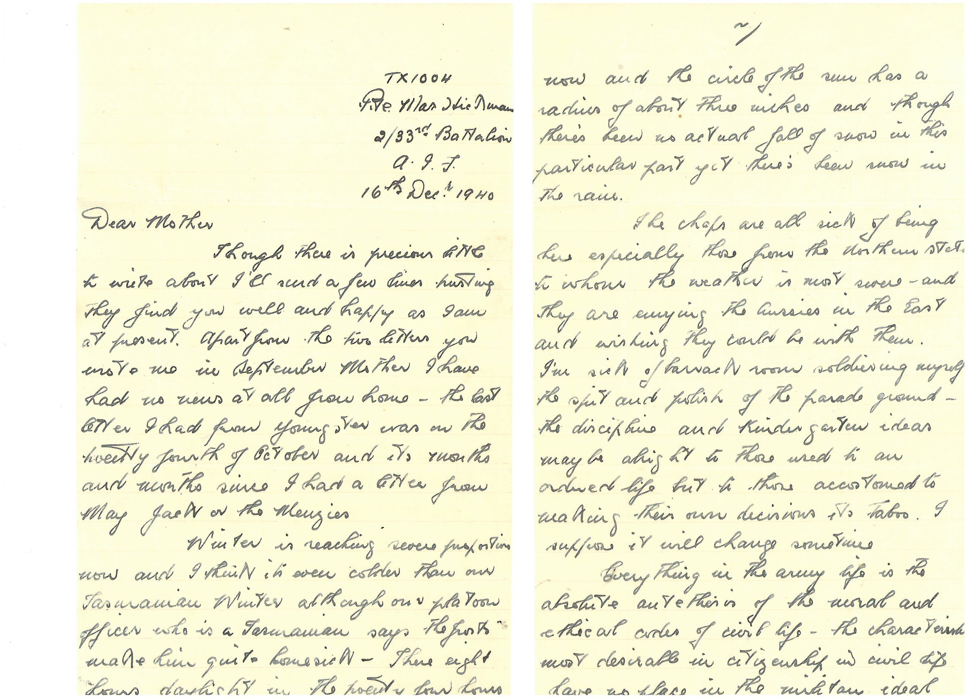 Though there is precious little to write about I’ll send a few lines trusting they find you well and happy as I am at present. Apart from the two letters you wrote me in September Mother I have had no news at all from home – the last letter I had from Youngster was on the twenty fourth of October and its months and months since I had a letter from May, Jack or the Menzies.