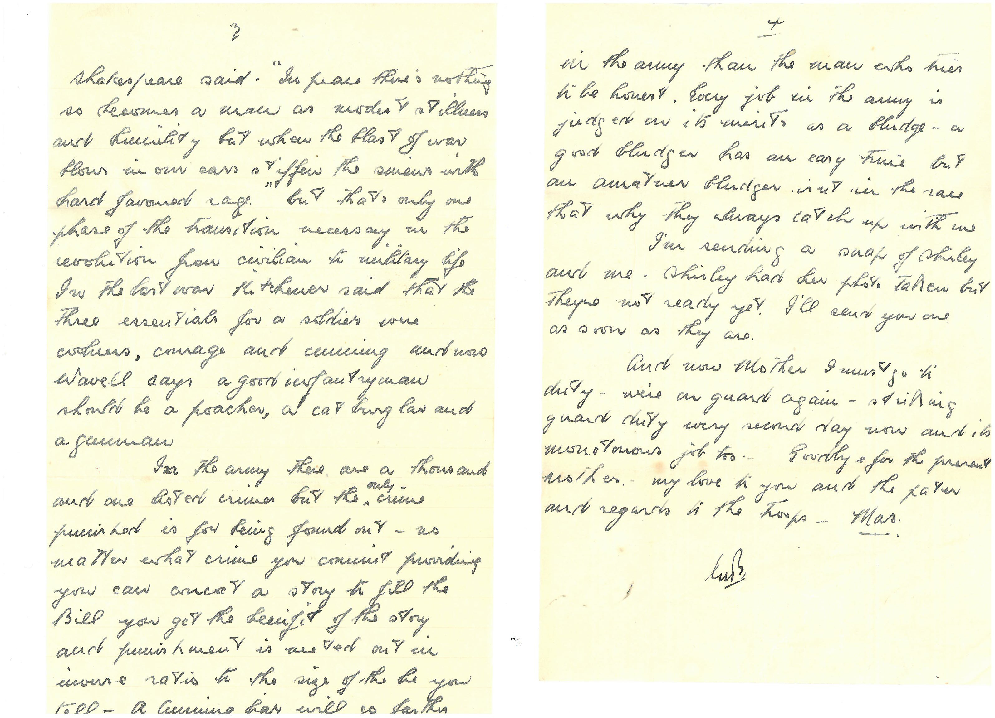 Everything in the army life is the absolute antithesis of the moral and ethical codes of civil life – the characteristics most desirable in citizenship in civil life have no place in the military ideal. Shakespeare said ‘In peace there’s nothing so becomes a man as modest stillness and humility but when the blast of war blows in our ears stiffen the sinews with hard favoured rage” but that’s only one phase of the transition necessary in the evolution from civilian to military life. In the last war Kitchener said that the three essentials for a soldier were coolness, courage and cunning and now Wavell says a good infantryman should be a poacher, a cat burglar and a gunman.