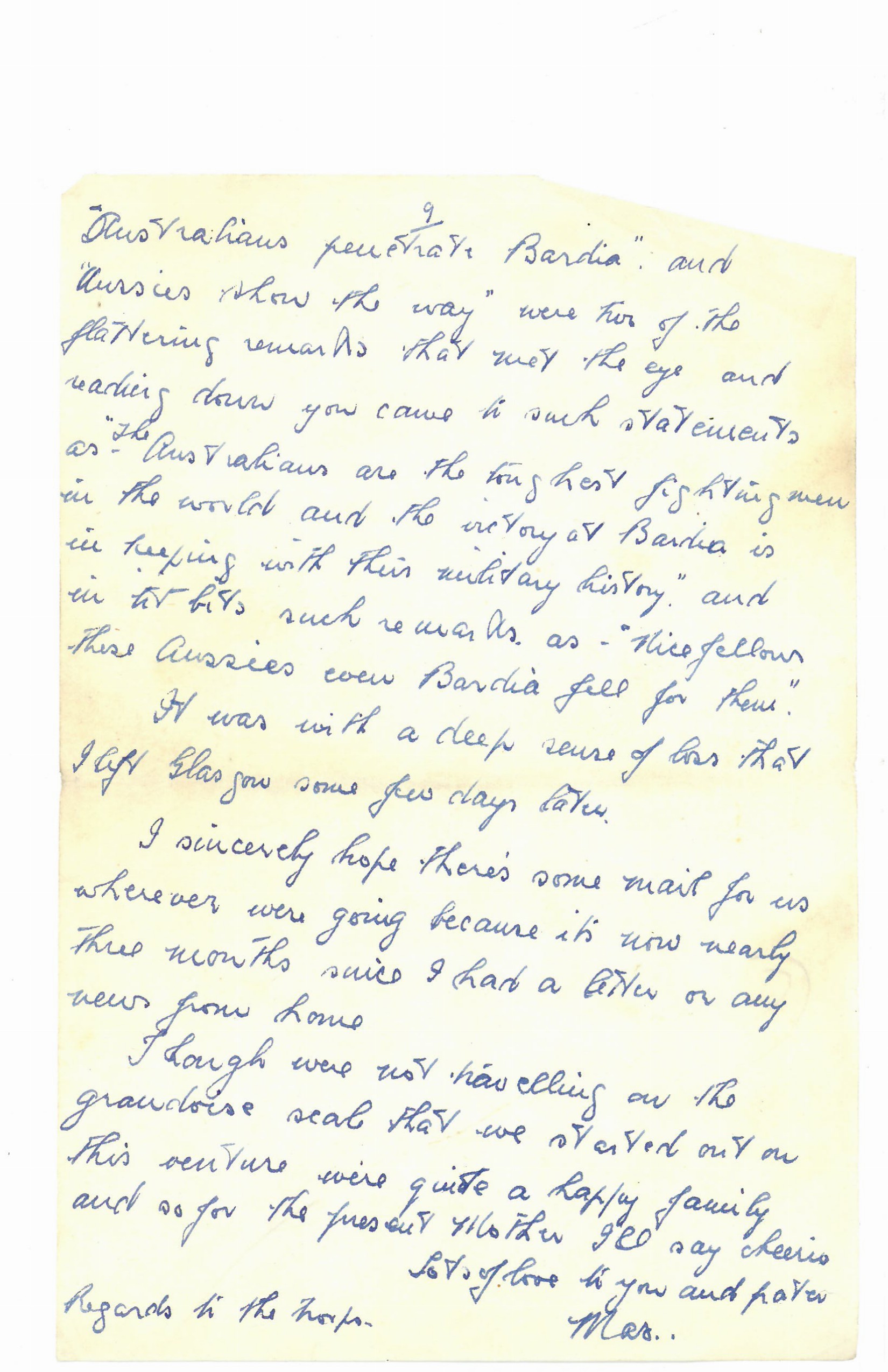 The Scotch people are the nearest to ourselves of any people int he world and the bond of friendship is wonderful – when our chaps in the East took Bardia the Scottish papers rang with praise. The English papers took full glory to themselves. The headlines of the Glasgow papers were of a type that in our papers would have been bombastic – such headlines as “Australians penetrate Bardia” and “Aussies show the way” were two of the flattering remarks that met the eye and reading down you came to such statements as “The Australians are the toughest fighting men in the world and the victory at Bardia is in keeping with their military history” and in titbits such remarks as – “Nice fellows these Aussies – even Bardia fell for them”.