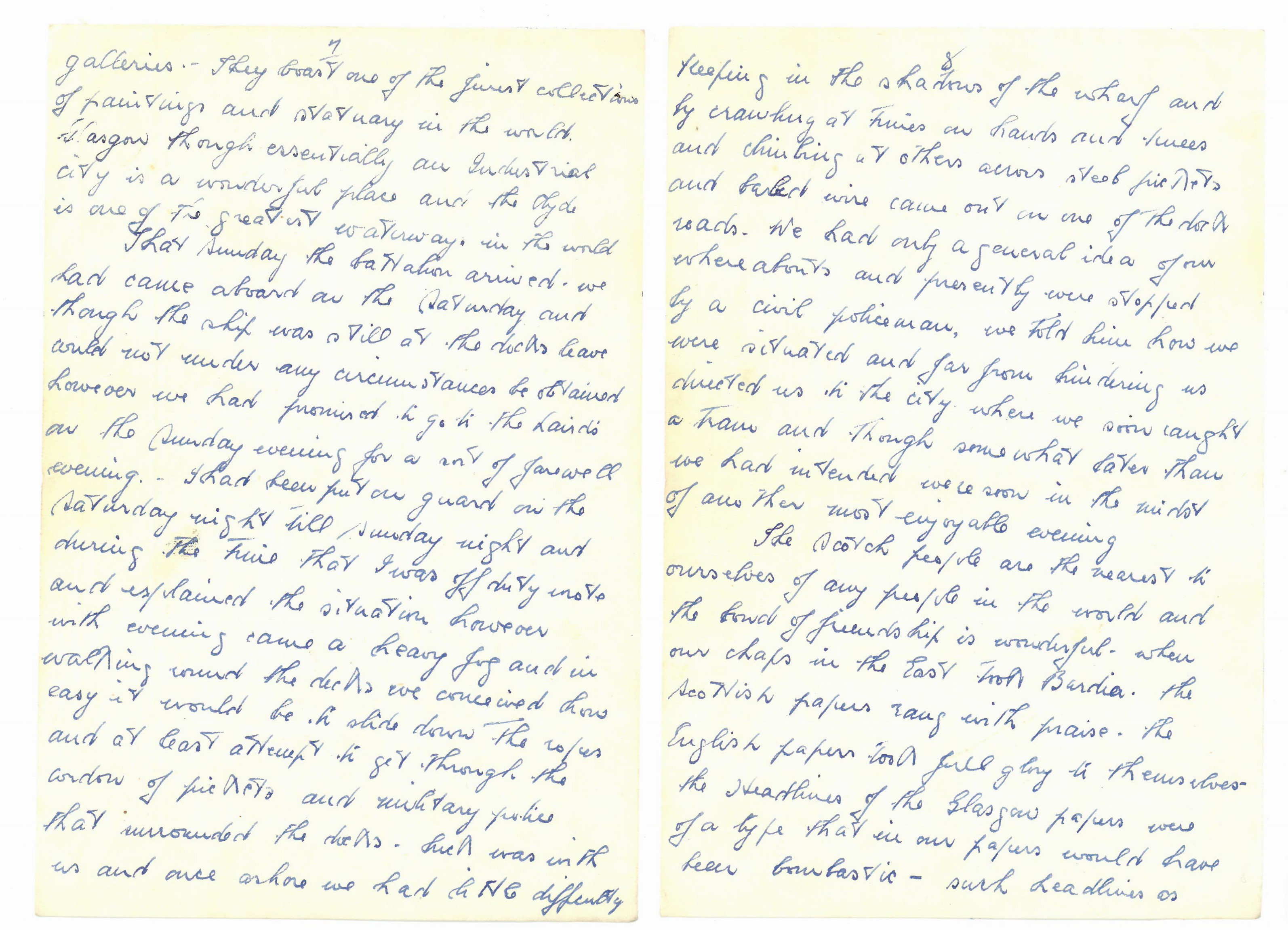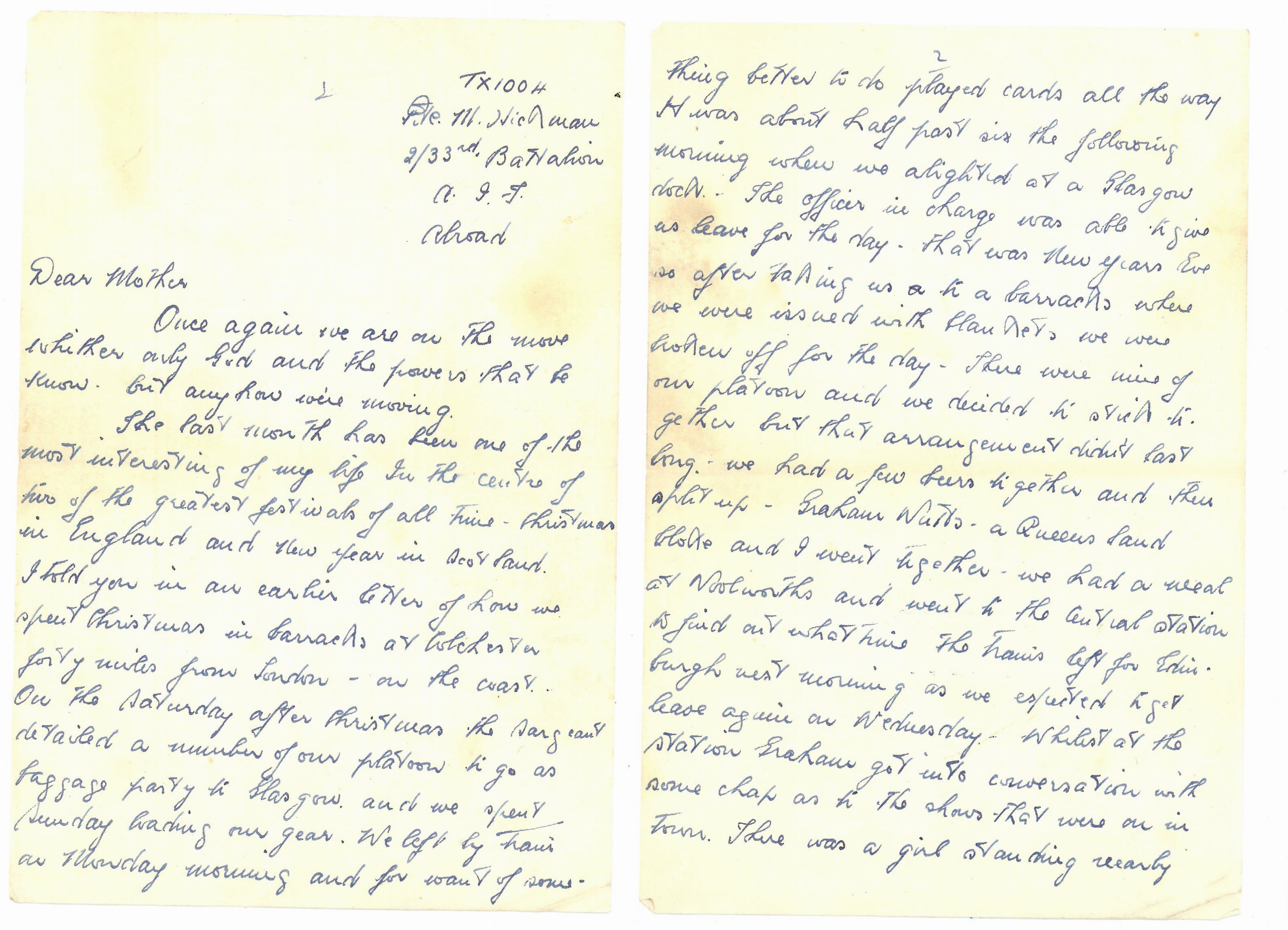 The last month has been one of the most interesting of my life. In the centre of two of the greatest festivals of all time – Christmas in England and New Year in Scotland. I told you in an earlier letter of how we spent Christmas in barracks at Colchester forty miles from London – on the coast. On the Saturday after Christmas the sergeant detailed a number of our platoon to go as baggage party to Glasgow and we spent Sunday loading our gear. We left by train on Monday morning and for want of something better to do played cards all the way.