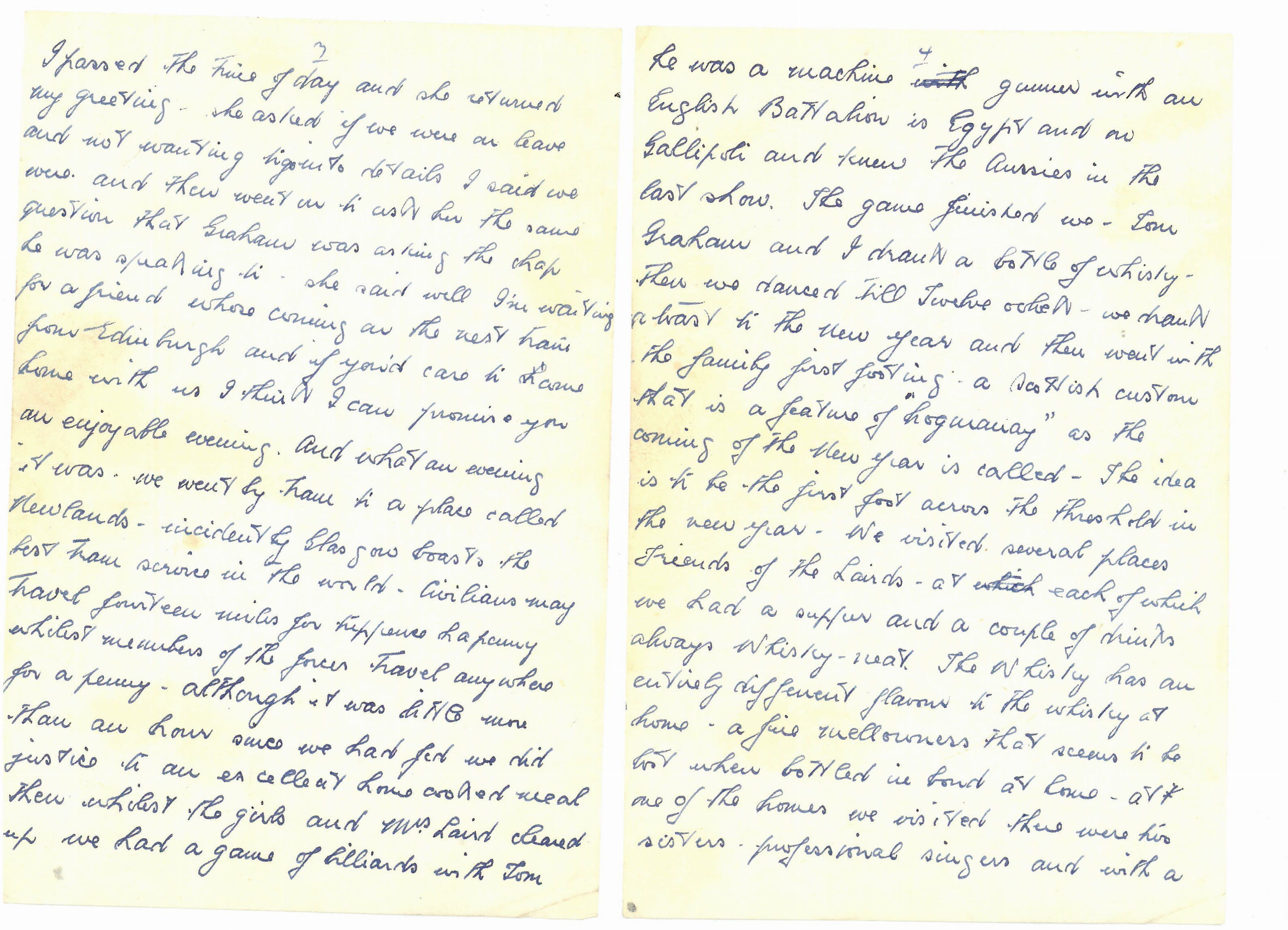 Although it was little more than an hour since we had fed we did justice to an excellent home cooked meal then whilst the girls and Mrs Laird cleared up we had a game of billiards with Tom. He was a machine gunner with an English Battalion in Egypt and on Gallipoli and knew the Aussies in the last show. The game finished, Tom, Graham and I drank a bottle of whisky then we danced till twelve o’clock and then went with the family first footing – a Scottish custom that is a feature of ‘Hogmanay’ as the coming of the New Year is called. The idea is to be the first foot across the threshold in the New Year. We visited several places – friends of the Lairds – at each of which we had a supper and a couple of drinks – always whisky – neat. The Whisky has an entirely different flavour to the whisky at home. At one of the homes we visited there were two sisters and with a piano playing they treated us to some really good singing.