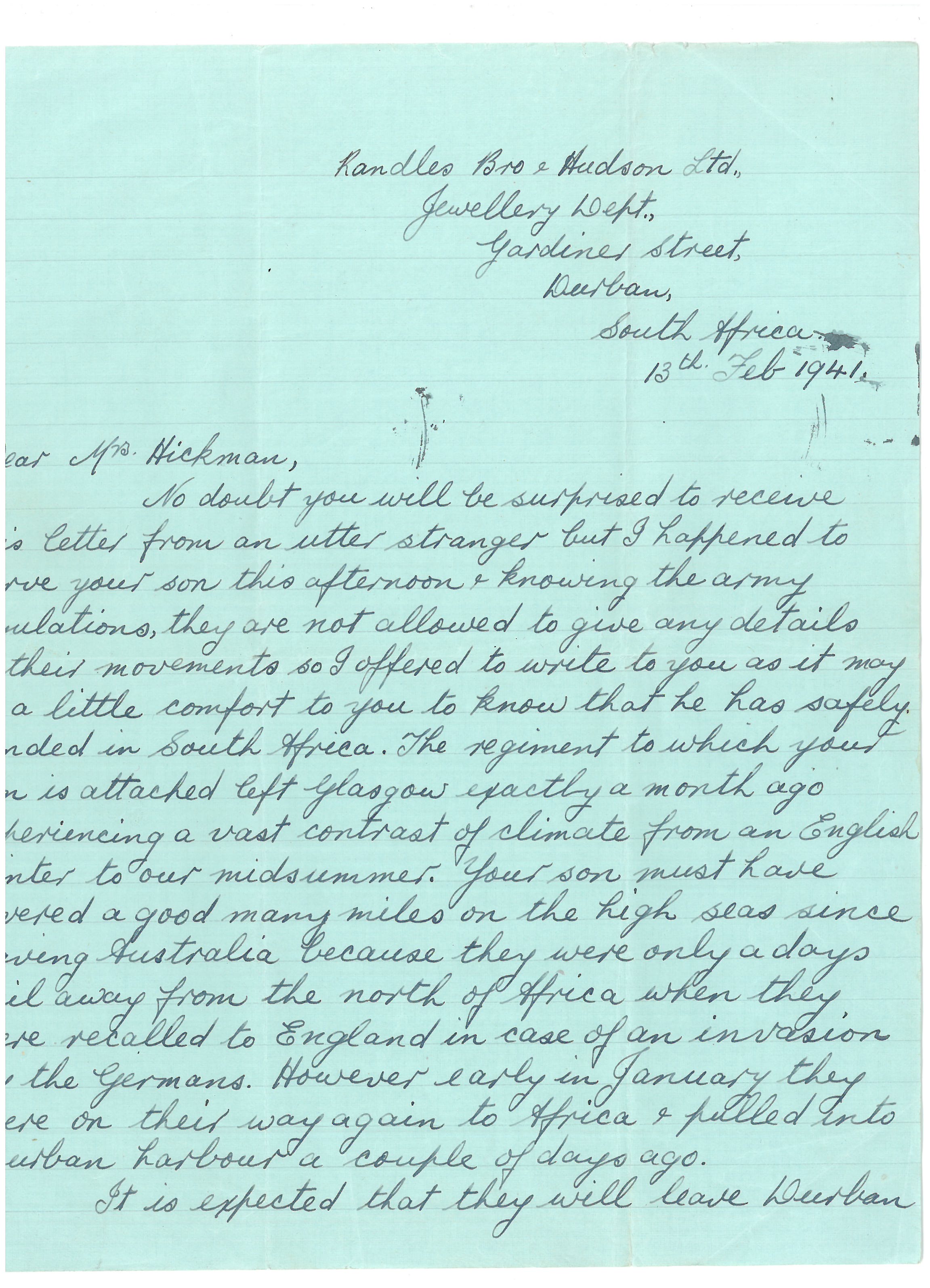 No doubt you will be surprised to receive this letter from an utter stranger but I happened to serve your son this afternoon and knowing the army regulations, they are not allowed to give any details of their movements so I offered to write to you as it may be a little comfort to you to know that he has safely landed in South Africa. The regiment to which your son is attached left Glasgow exactly a month ago experiencing a vast contrast of climate from an English winter to our midsummer. Your son must have covered a good many miles on the high seas since leaving Australia because they were only a day’s sail away from the north of Africa when they were recalled to England in case of an invasion by the Germans. However early in January they were on their way again to Africa and pulled into Durban harbour a couple of days ago.