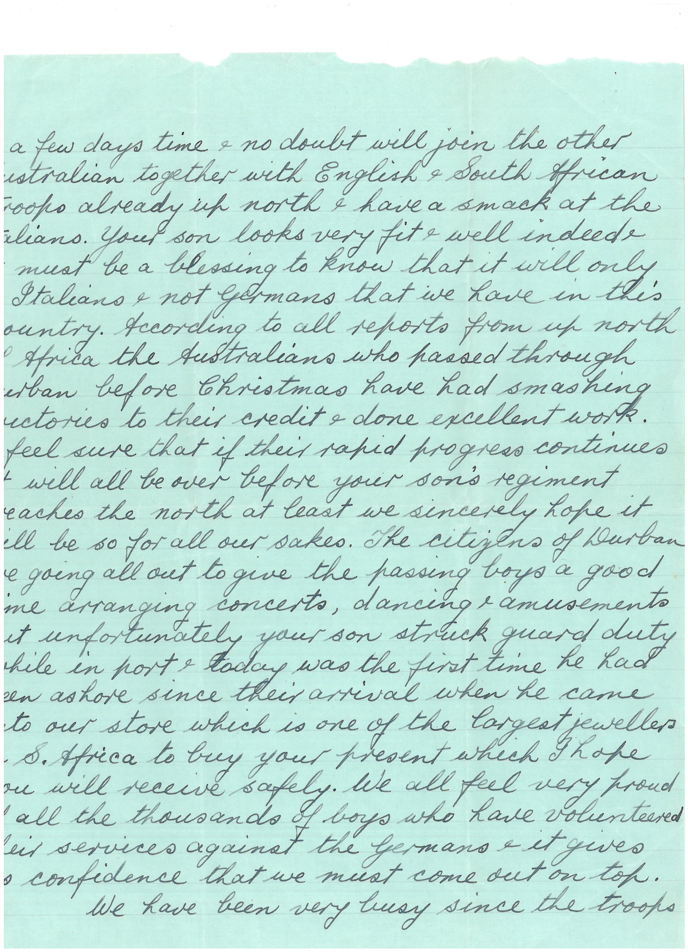 It is expected that they will leave Durban in a few days’ time and no doubt will join the other Australians together with English and South African troops already up north and have a smack at the Italians. Your son looks very fit and well indeed and it must be a blessing to know that it will only be Italians and not Germans that we have in this country. According to all reports from up north of Africa the Australians who passed through Durban before Christmas have had smashing victories to their credit and done excellent work. I feel sure that if their rapid progress continues it will all be over before your son’s regiment reaches the north at least we sincerely hope it will be so for all our sakes.