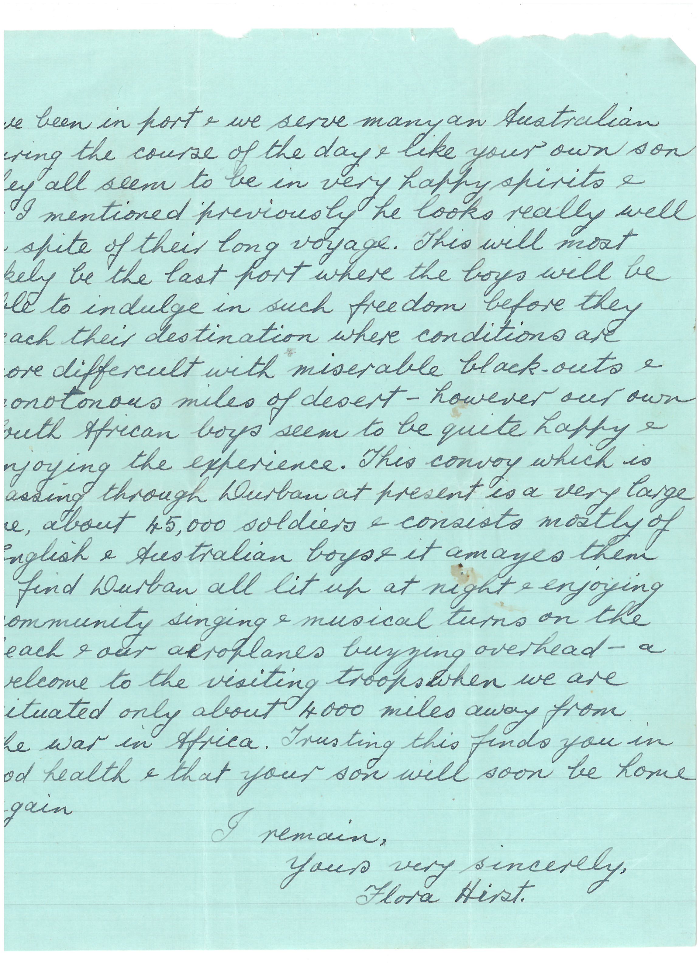 This convoy which is passing through Durban at present is a very large one, about 45,000 soldiers and consists mostly of English and Australian boys and it amazes them to find Durban all lit up at night and enjoying community singing and musical turns on the beach and our aeroplanes buzzing overhead – a welcome to the visiting troops when we are situated only about 4000 miles away from the war in Africa. Trusting this finds you in good health and that your son will soon be home again.