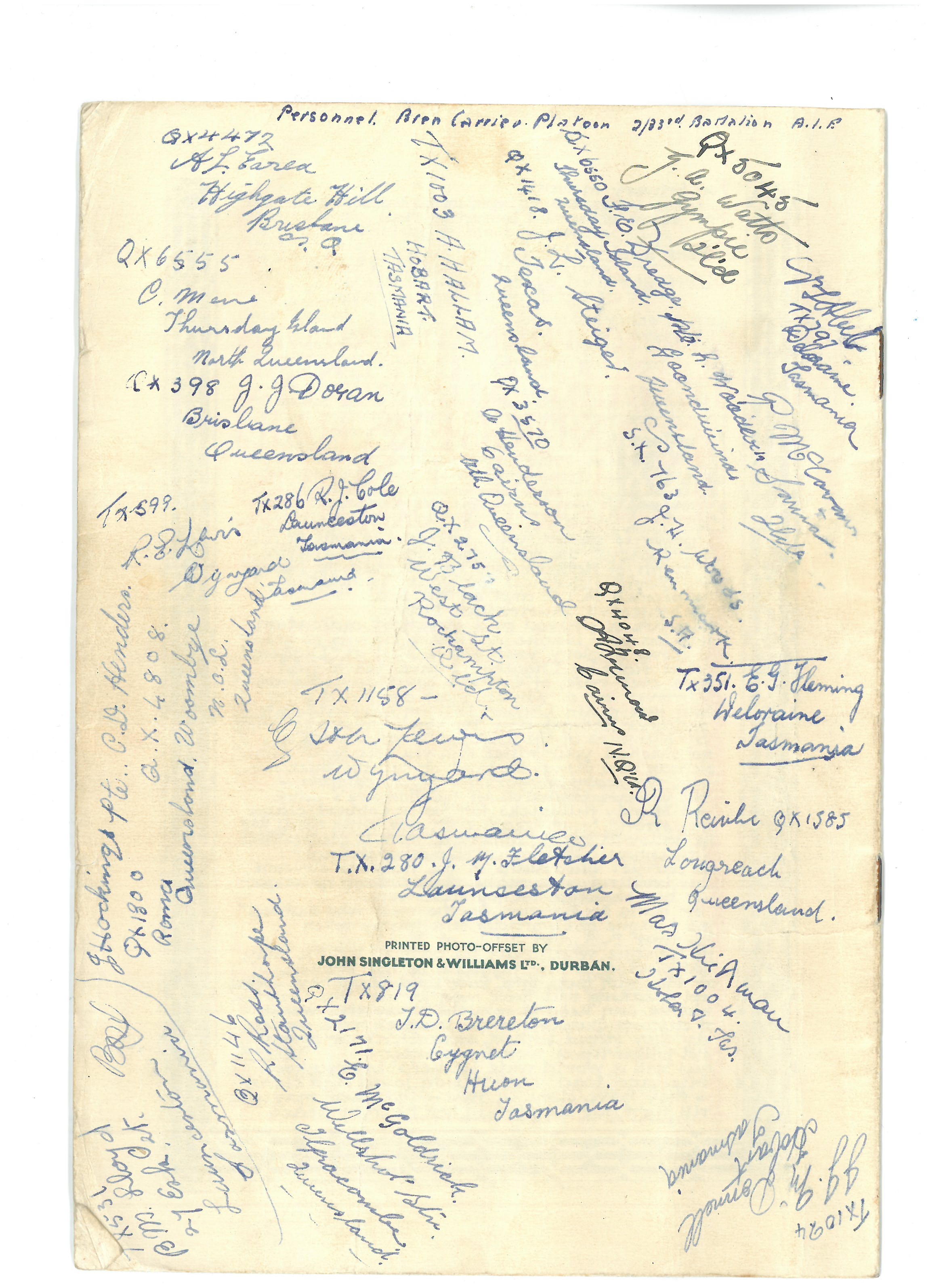 The back page is covered with autographs of members of the Carrier Platoon: