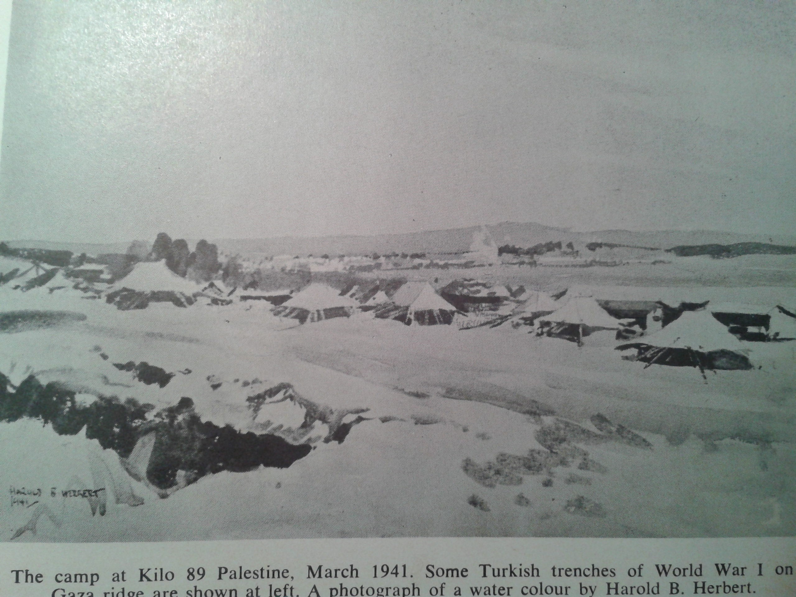 With the threat of General Rommel’s Africa Corps in the Western Desert and the withdrawal of our forces from Tobruk, our 25th Brigade was ordered to prepare to move on 11 April. During the waiting period, steel helmets were painted buff and soaked in sand while the paint was wet. Vehicles were treated in much the same way, and the windscreens removed…..