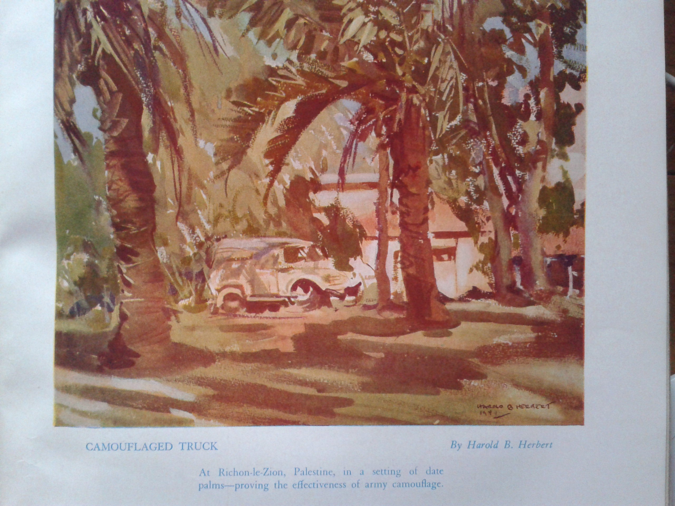 Camouflaged truck at Rishon-le-Zion: painting by Harold Herbert, published in the ‘Christmas book’, Active Service