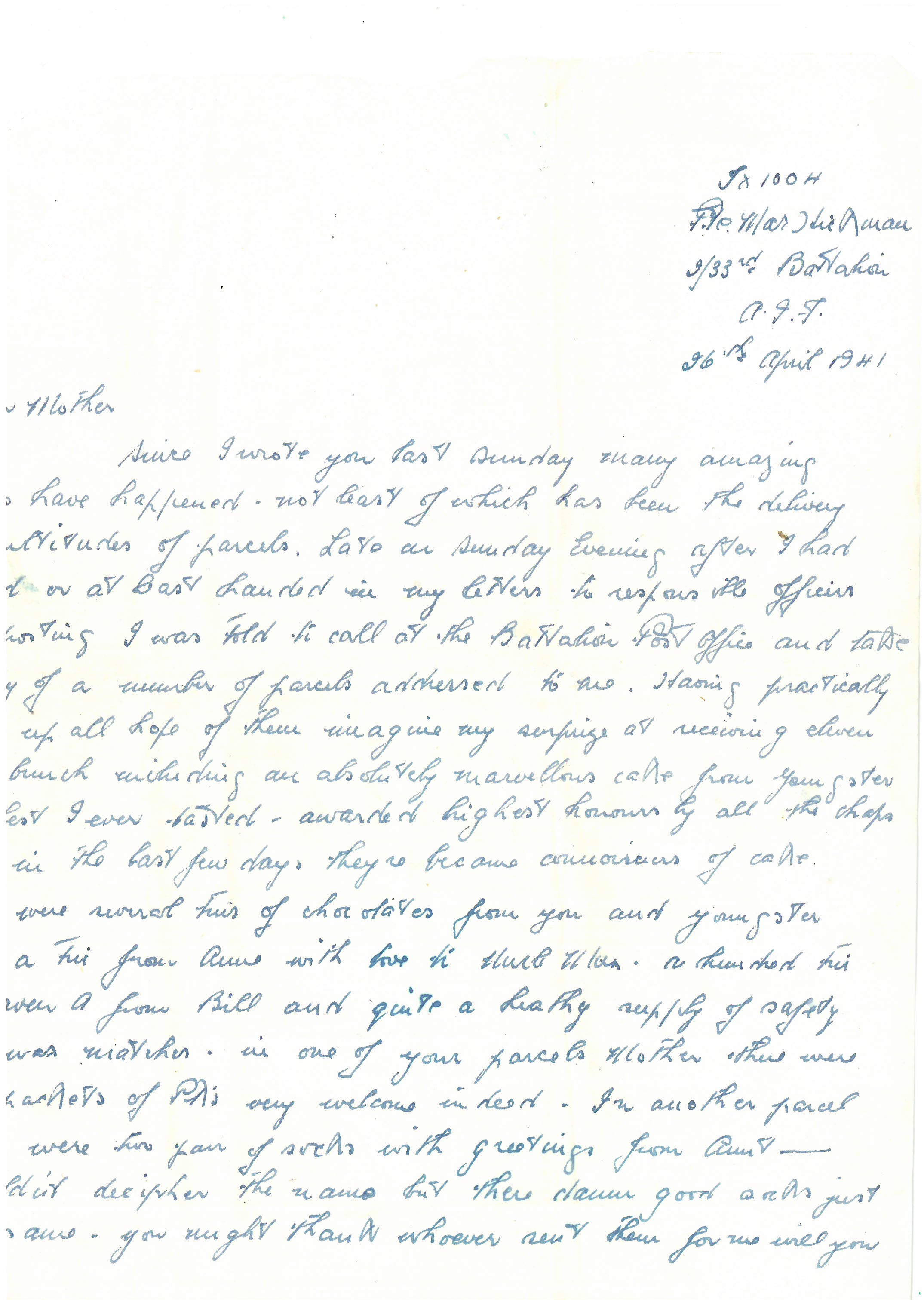 Since I wrote you last Sunday many amazing things have happened, not least of which has been the delivery of multitudes of parcels. Late on Sunday evening after I had posted or at least handed in my letters to responsible officers for posting I was told to call at the Battalion Post Office and take delivery of a number of parcels addressed to me. Having practically given up all hope of them imagine my surprise at receiving eleven in a bunch including an absolutely marvellous cake from Youngster – the best I ever tasted – awarded highest honours by all the chaps and in the last few days they’ve become conscious of cake. There were several tins of chocolates from you and youngster and a tin from Anne with love to Uncle Max, a hundred tins of Craven A from Bill and quite a healthy supply of safety and wax matches. In one of your parcels Mother there were six packets of PK’s – very welcome indeed. In another parcel there were two pair of socks with greetings from Aunt_____. I couldn’t decipher the name but they’re damn good socks just the same – you might thank whoever sent them for me will you.