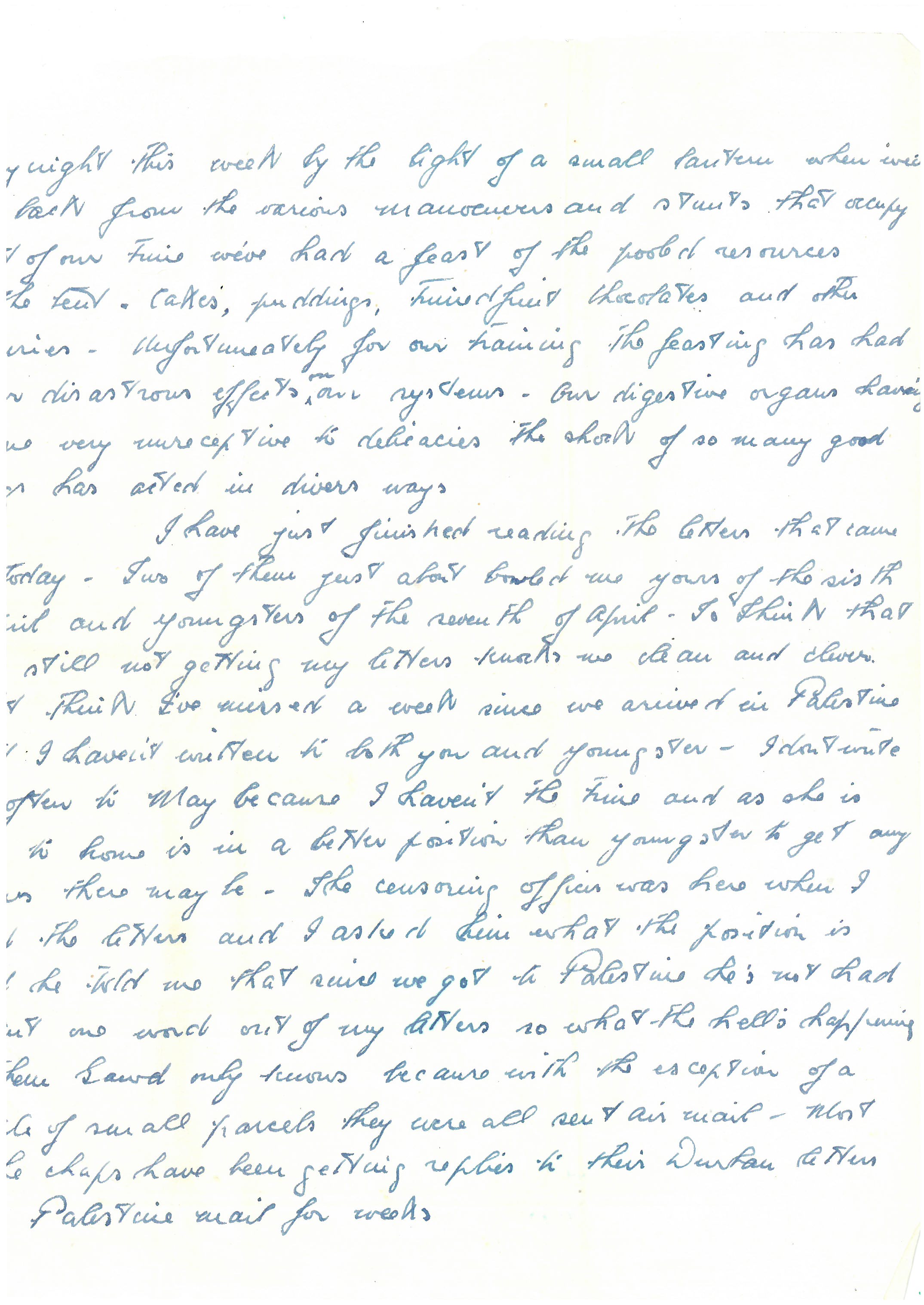 I have just finished reading the letters that came in today. Two of them just about bowled me – yours of the sixth of April and Youngsters of the seventh of April. To think that you’re still not getting my letters knocks me clean and clever. I don’t think I’ve missed a week since we arrived in Palestine that I haven’t written to both you and youngster – I don’t write as often to May because I haven’t the time and as she is close to home is in a better position than youngster to get any news there may be. The censoring officer was here when I read the letters and I asked him what the position is and he told me that since we got to Palestine he’s not had to cut one word out of my letters so what the hell’s happening to them Gawd only knows because with the exception of a couple of small parcels they were all sent airmail. Most of the chaps have been getting replies to their Durban letters and Palestine mail for weeks.