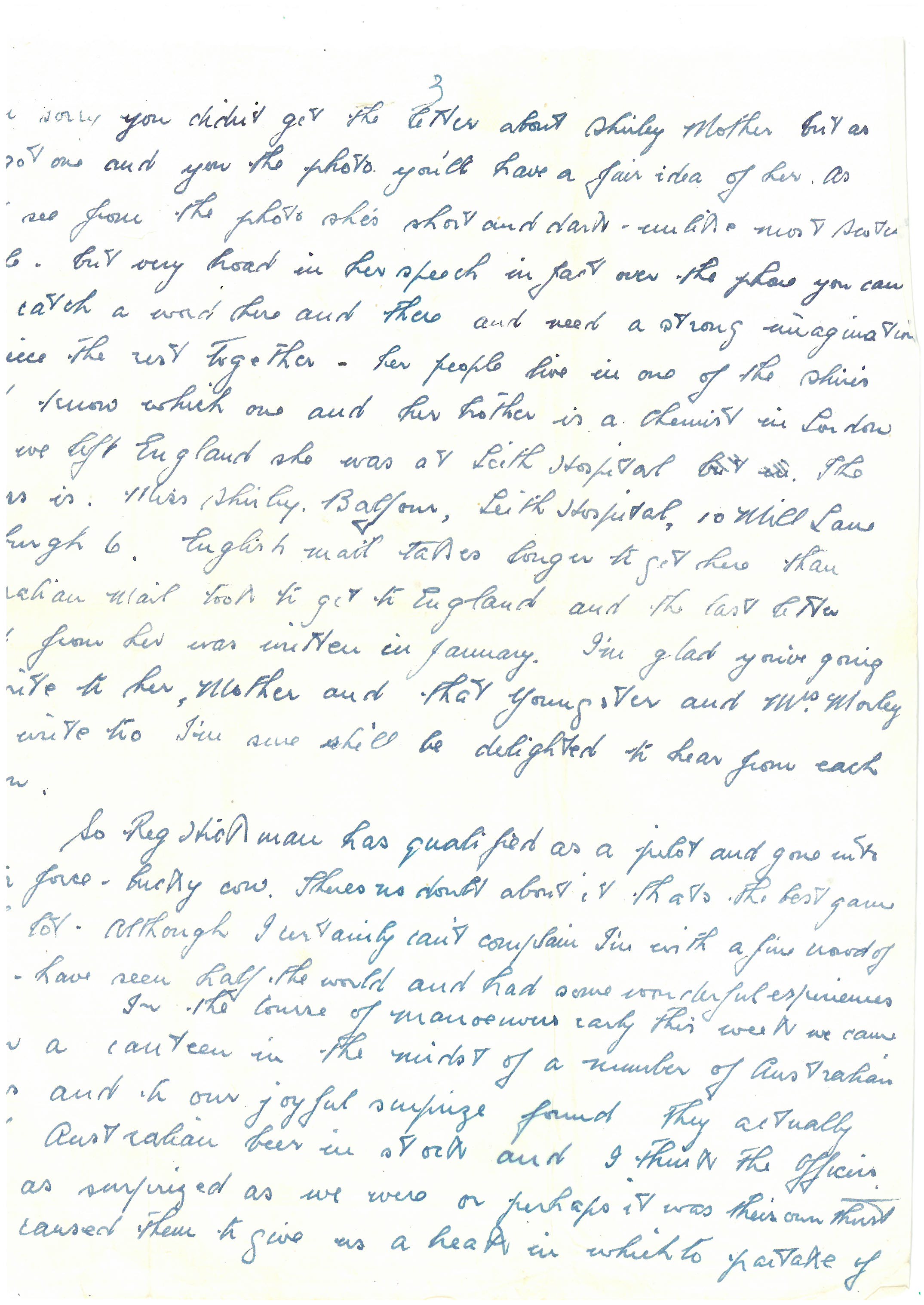 I’m sorry you didn’t get the letter about Shirley, Mother but as May got one and you the photo you’ll have a fair idea of her. As you’ll see from the photo she’s short and dark, unlike most Scotch people, but very broad in her speech – in fact over the phone you can only catch a word here and there and need a strong imagination to piece the rest together. Her people live in one of the shire’s – I don’t know which one – and her brother is a chemist in London. When we left England she was at Leith Hospital. The address is Leith Hospital, 10 Mill Lane Edinburgh 6. English mail takes longer to get here than Australian mail took to get to England and the last letter I had from her was written in January. I’m glad you’re going to write to her, Mother and that Youngster and Mrs Morley will write too. I’m sure she’ll be delighted to hear from each of you.