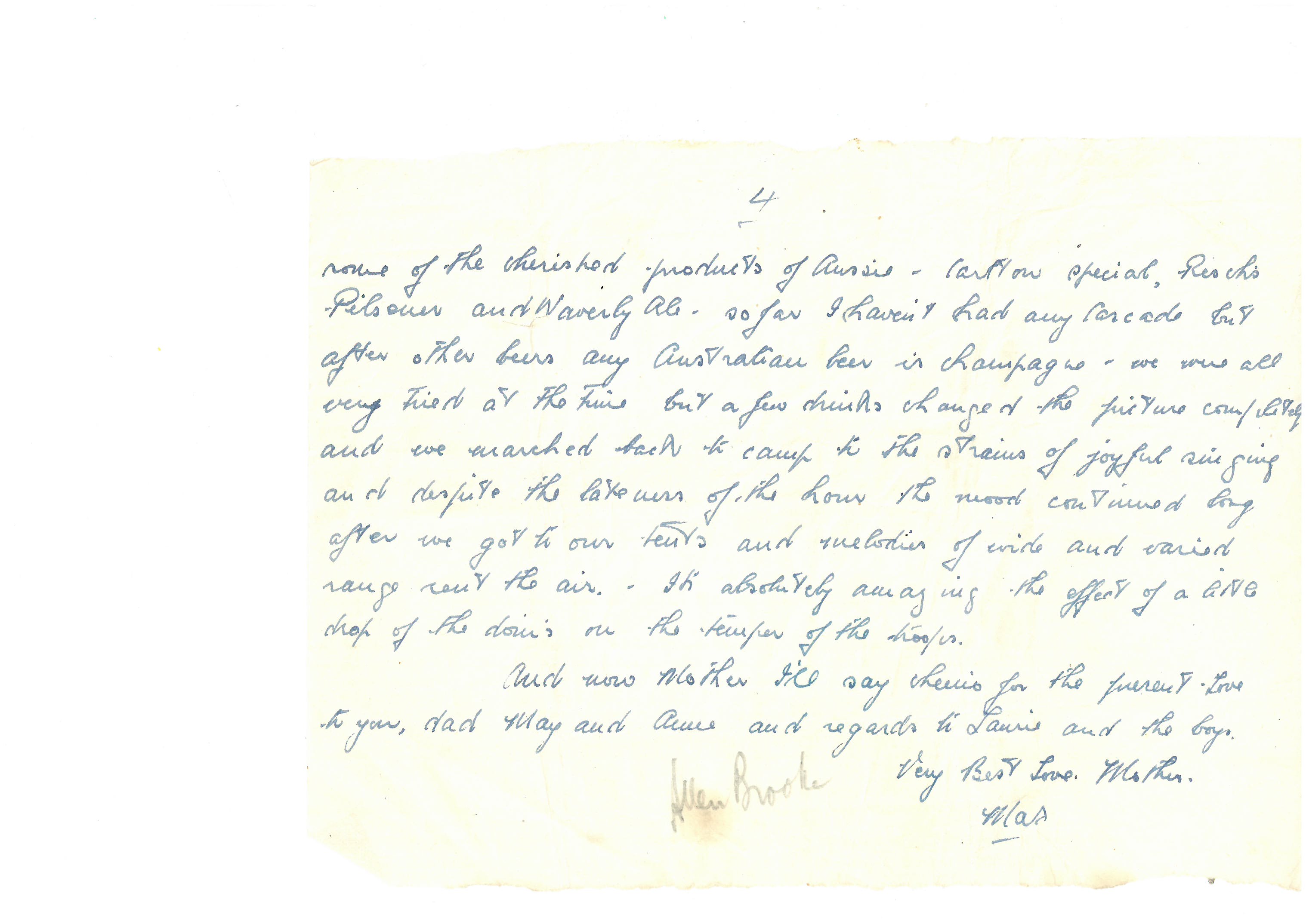 And now Mother I’ll say cheerio for the present. Love to you, dad, May and Anne and regards to Laurie and the boys.