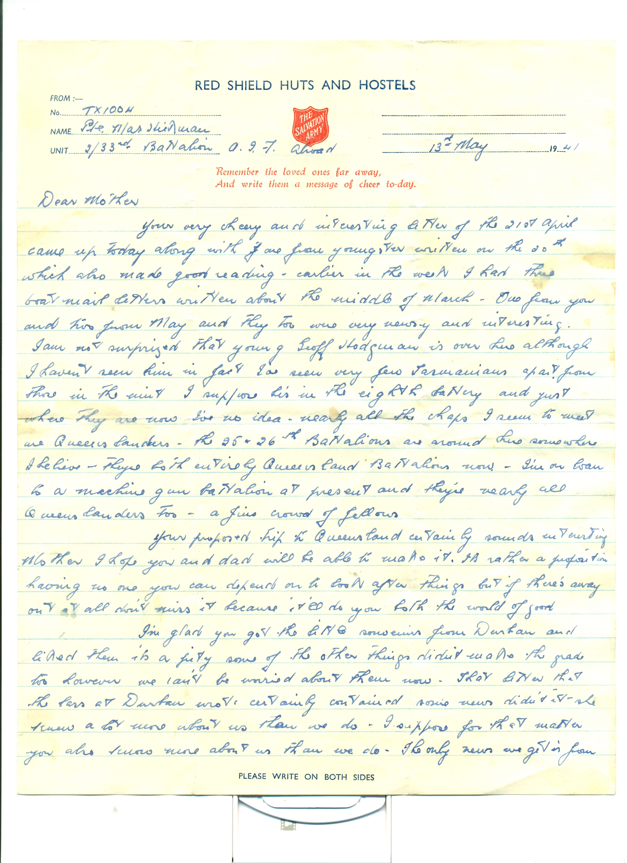 Your proposed trip to Queensland certainly sounds interesting Mother. I hope you and Dad will be able to make it. It’s rather a proposition having no one you can depend on to look after things but if there’s a way out at all, don’t miss it because it’ll do you both the world of good.