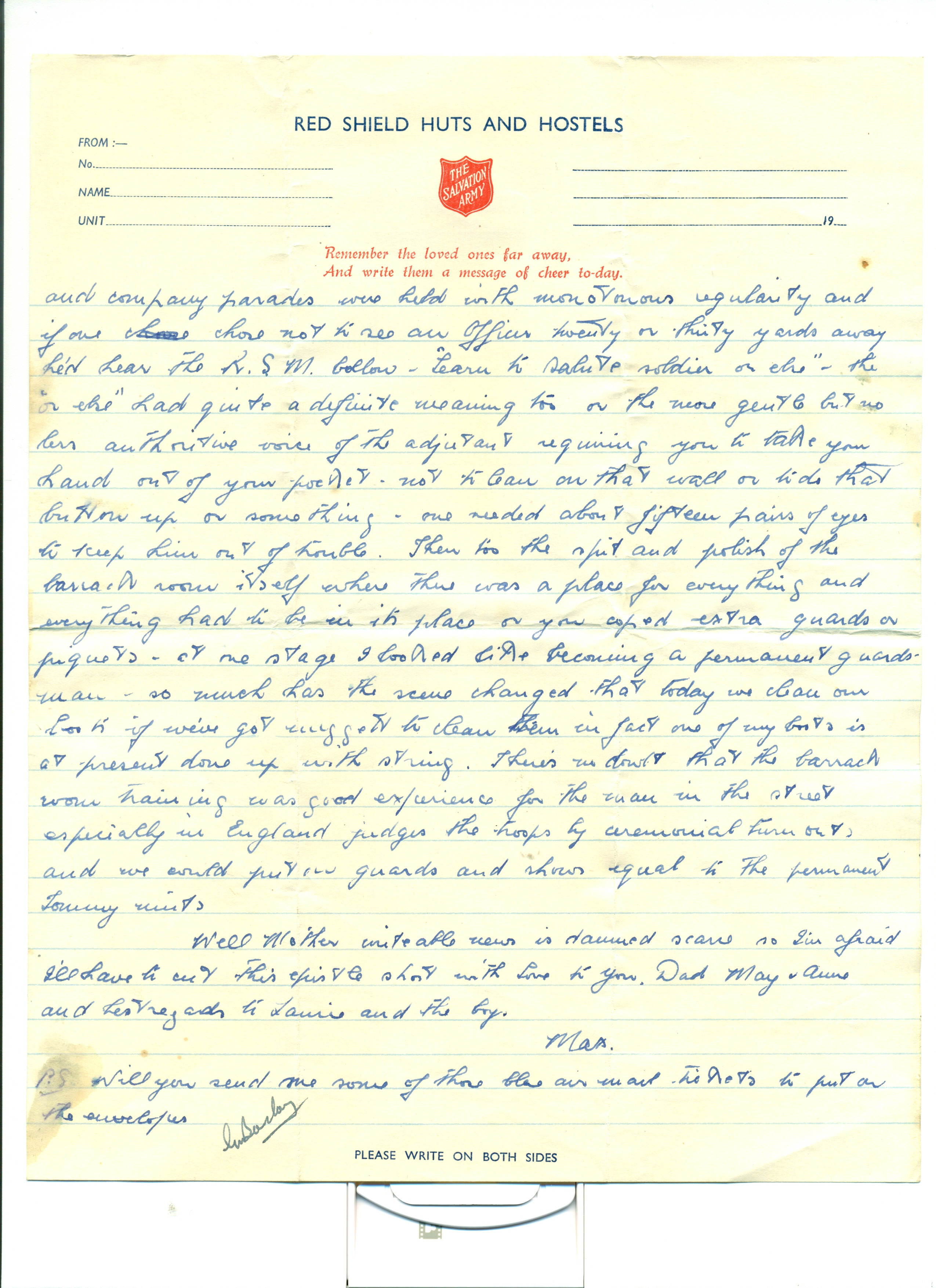 Well Mother writeable news is damned scarce so I’m afraid I’ll have to cut this epistle short with love to you, Dad, May & Anne and best regards to Laurie and the boys.