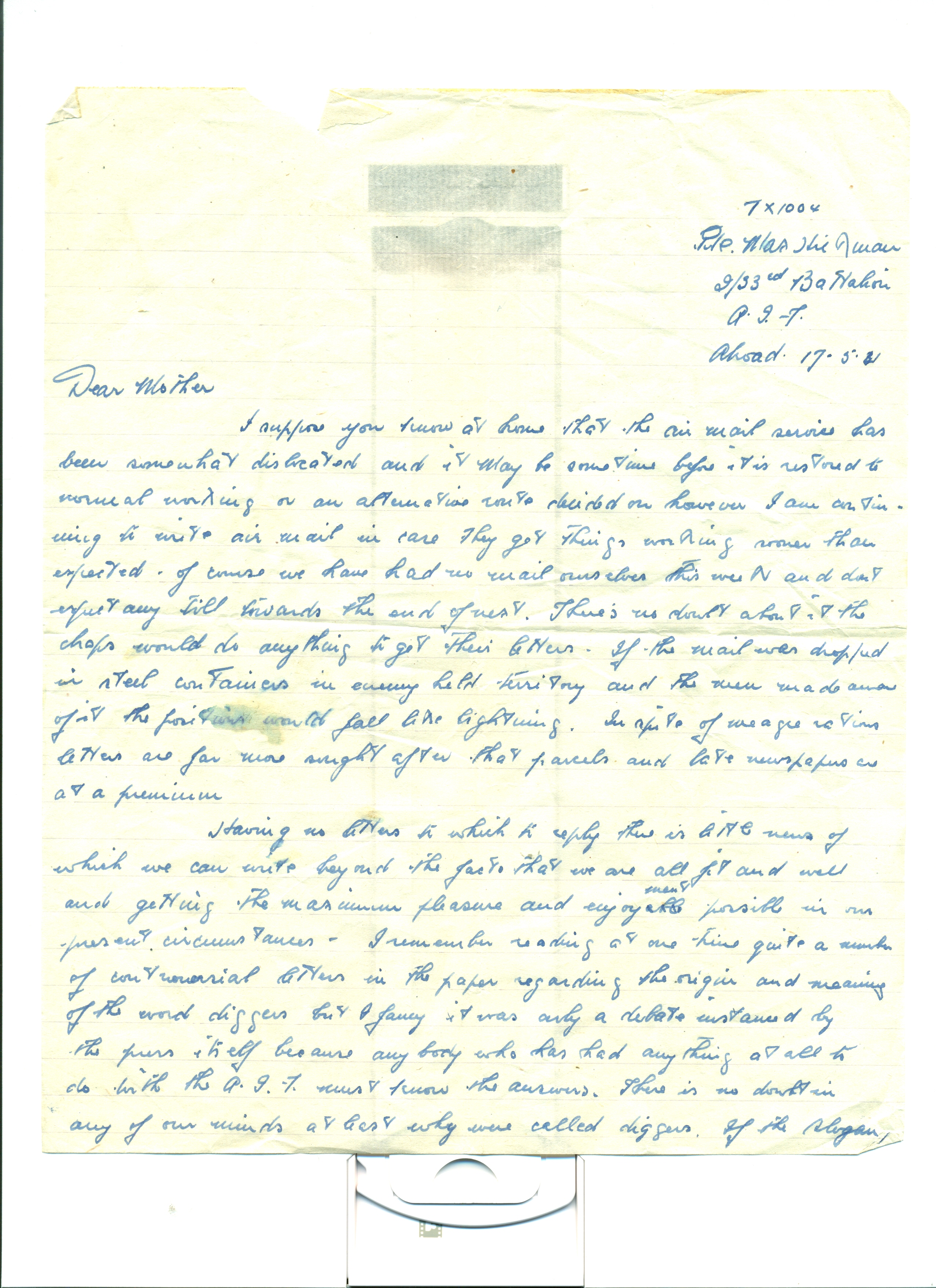 Having no letters to which to reply there is little news of which we can write beyond the fact that we are all fit and well and getting the maximum pleasure and enjoyment possible in our present circumstances. I remember reading at one time quite a number of controversial letters in the paper regarding the origin and meaning of the word diggers but I fancy it was only a debate instanced by the press itself because anybody who has had anything at all to do with the AIF must know the answer. There is no doubt in any of our minds at least why we’re called diggers. If the slogan “Dig for Victory” has any significance at all then we’ll walk it in – we had quite a foretaste of it in England where we moved thousands of tons of chalk and other subterranean formations and since coming east have literally undermined the place. To the observers eye we must appear more as an archaeological research expedition than an army but the picks and shovels they give us to use would be more in keeping with a Sunday School picnic at the beach.