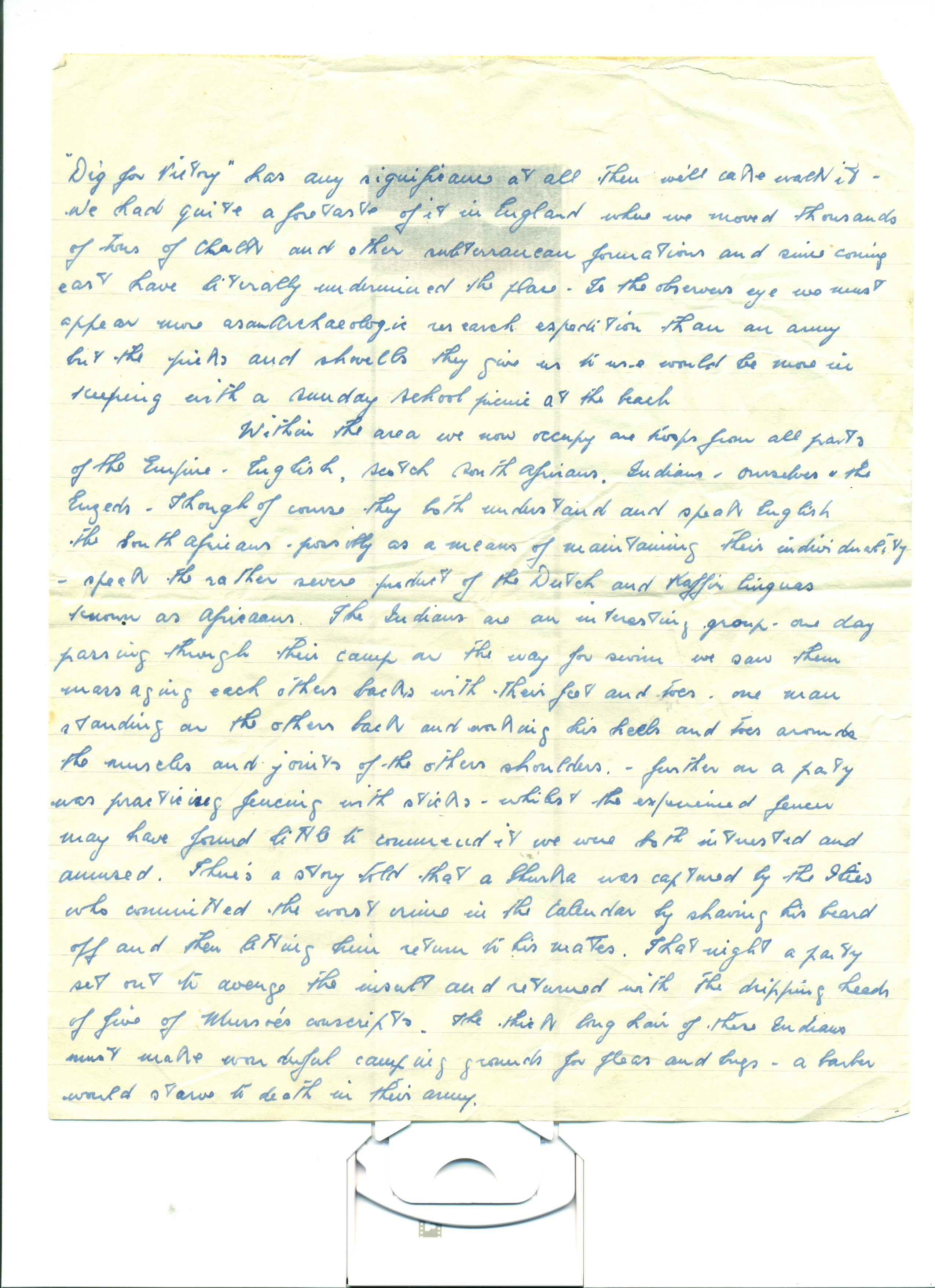 Within the area we now occupy are troops from all parts of the Empire – English, Scotch, South Africans, Indians, ourselves and the Enzeds. Though of course they both understand and understand English the South Africans – possibly as a means of maintaining their individuality – speak the rather severe product of Dutch and Kaffir languages known as Africaans. The Indians are an interesting group – one day passing through their camp on the way for a swim we saw them massaging each others’ backs with their feet and toes – one man standing on the other’s back and working his heels and toes around the muscles and joints of the other’s shoulders. Further on a party was practising fencing with sticks – whilst the experienced fencer may have found little to commend it we were both interested and amused. There’s a story told that a Ghurka was captured by the Ities who committed the worst crime in the calendar by shaving his beard off and then letting him return to his mates. That night a party set out to avenge the insult and returned with the dripping heads of five of Musso’s conscripts. The thick long hair of these Indians must make wonderful camping grounds for fleas and bugs – a barber would starve to death in their army.