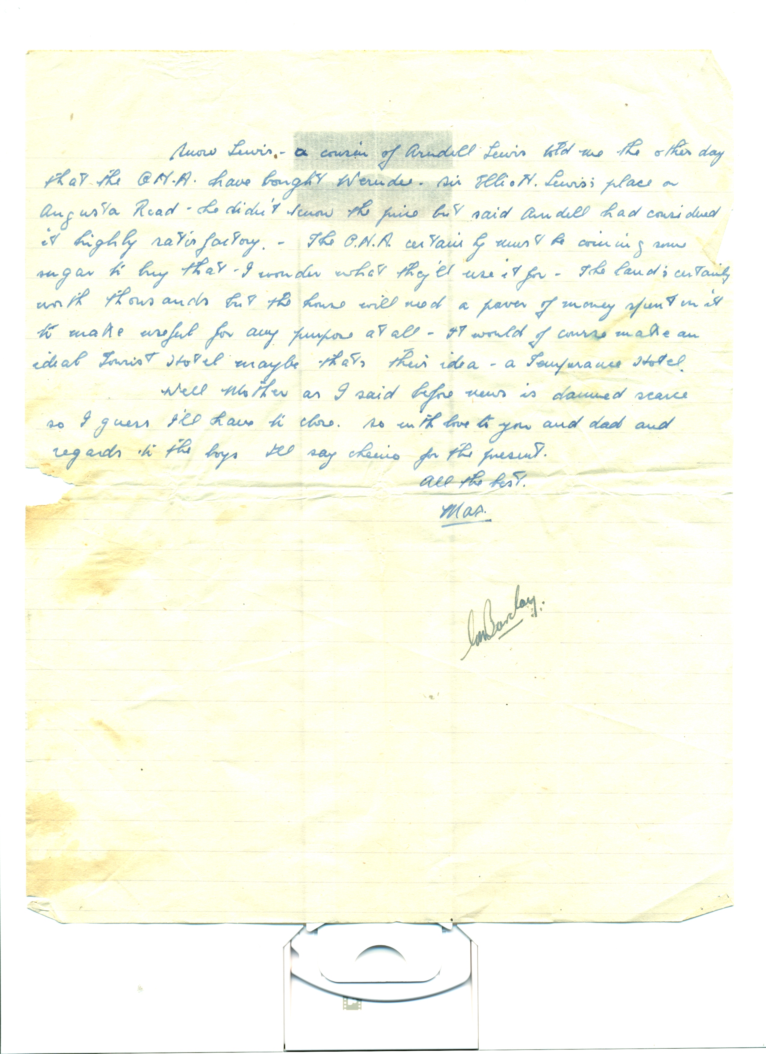 Snow Lewis – a cousin of Arndell Lewis – told me the other day that the OHA have bought Wendee – Sir Elliott Lewis’s place on Augusta Road. He didn’t know the price but said Arndell had considered it highly satisfactory. The OHA certainly must be coining some sugar to buy that. I wonder what they’ll use it for. The land’s certainly worth thousands but the house will need a power of money spent on it to make it useful for any purpose at all. It would of course make an ideal Tourist Hotel – maybe that’s their idea – a Temperance Hotel.
