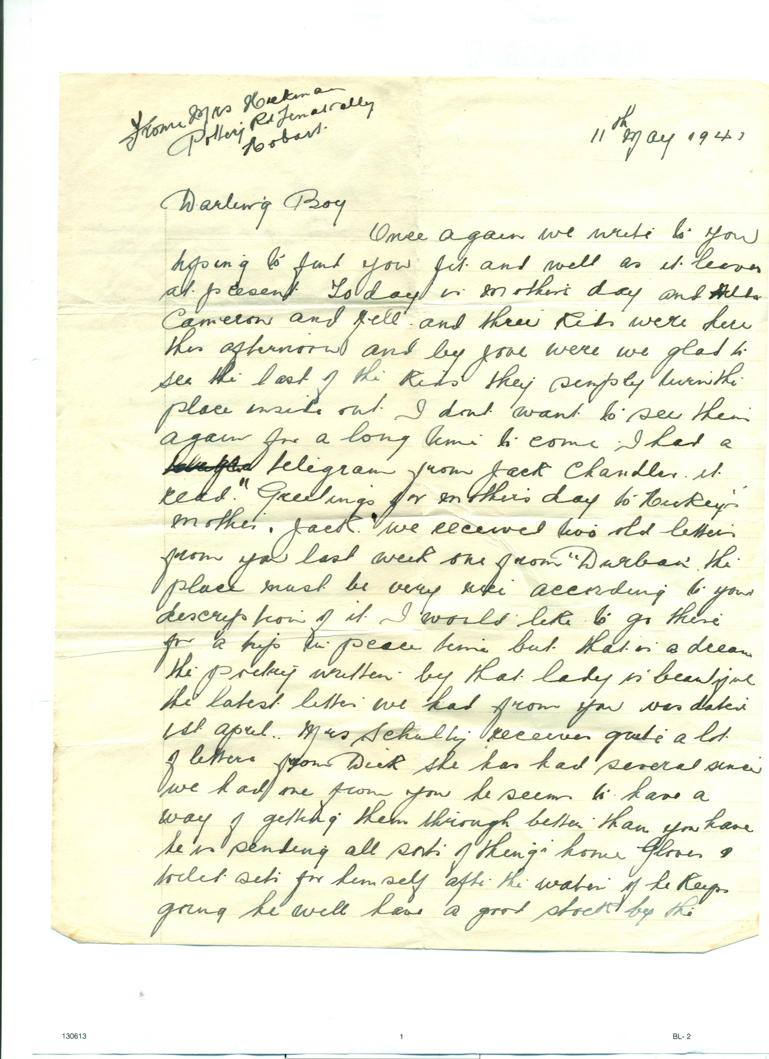 Once again we write to you hoping to find you fit and well as it leaves us at present. Today is Mothers Day and Cameron and Nell and three kids were here this afternoon and by jove were we glad to see the last of the kids. They simply turn the place inside out. I don’t want to see them again for a long time to come. I had a telegram from Jack Chandler – it read “Greetings for Mothers day to Hickey’s mother. Jack”. We received two old letters from you last week – the one from Durban – the place must be very nice according to your description of it I would like to go there for a trip in peace time but that is a dream. The poetry written by that lady is beautiful. The latest letter we had from you was dated 1st April. Mrs Schultz receives quite a lot of letters from Dick. She has had several since we had one from you – he seems to have a way of getting them through better than you have. He is sending all sorts of things home – gloves and toilet sets for himself after the war. If he keeps going he will have a good stock by the time he gets home again.
