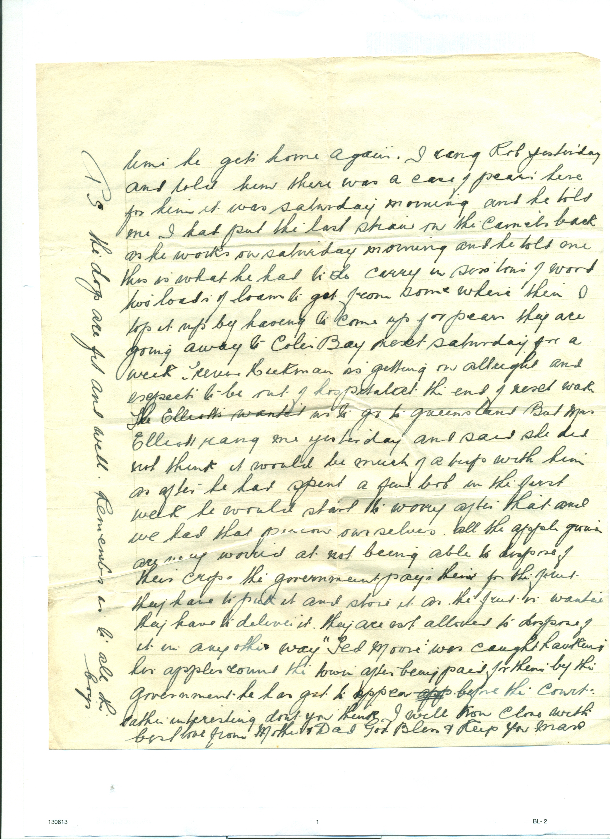 The Elliotts wanted us to go to Queensland but Mrs Elliott rang me yesterday and said she did not think it would be much of a trip with him as after he had spent a few bob on the first week he would start to worry after that and we and that opinion ourselves. All the apple growers are very worried about not being able to dispose of their crop. The government pays them for the fruit , they have to pick it and store it. As the fruit is wanted they have to deliver it. They are not allowed to dispose of it in any other way. Ted Moore was caught hawking his apples round the town after being paid for them by the government. He has got to appear before the Court. Rather interesting, don’t you think? I will now close with best love from Mother & Dad. God bless you & keep you Max.