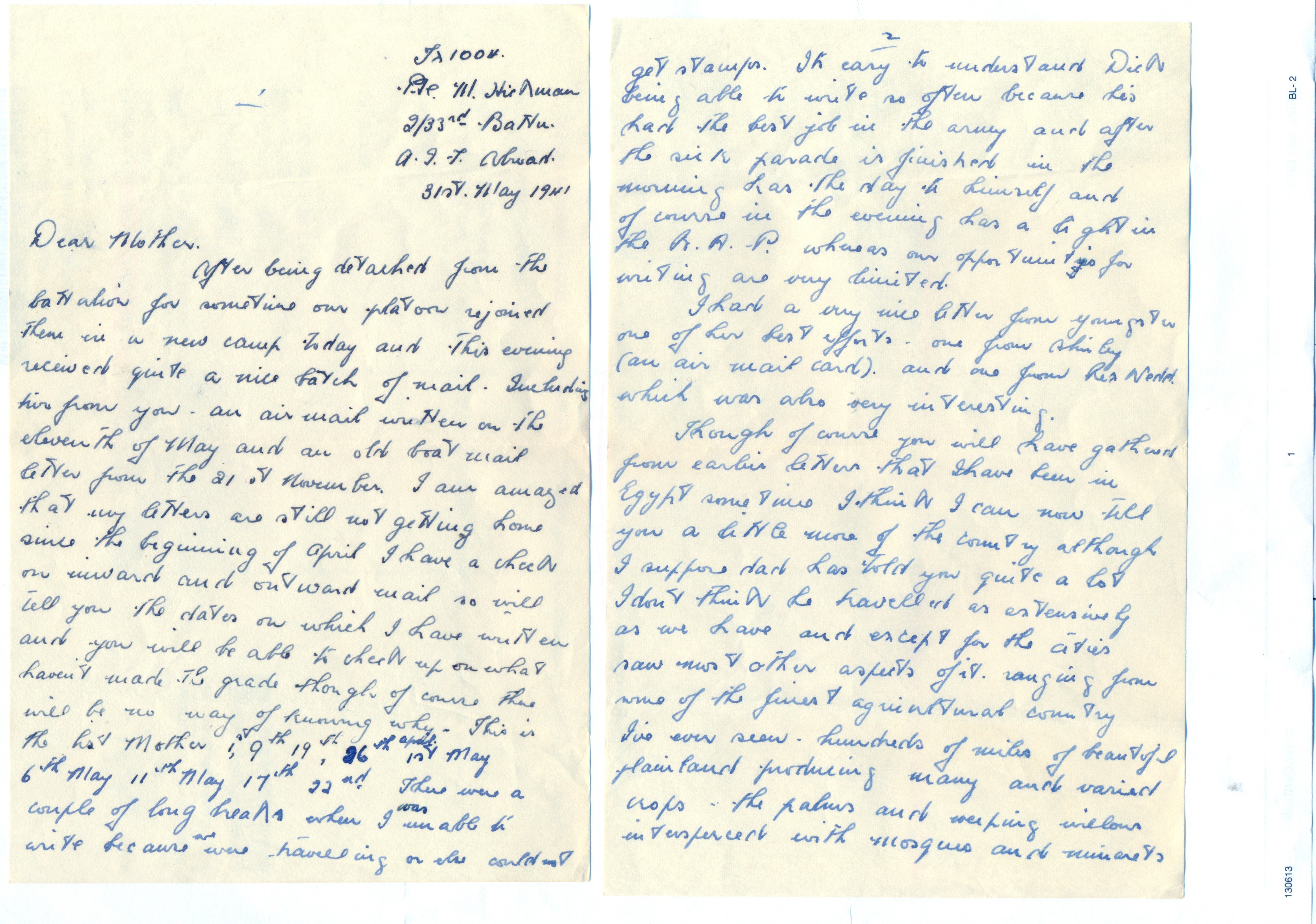 After being detached from the battalion for some time our platoon rejoined them in a new camp today and this evening received quite a nice batch of mail, including two from you – an airmail written on the eleventh of May and an old boat mail letter from the 21st of November. I am amazed that my letters are still not getting home. Since the beginning of April I have a check on inward and outward mail so will tell you the dates on which I have written and you will be able to check up on what hasn’t made the grade though of course there will be no way of knowing why – this is the list mother – 1st, 9th, 19th, 26th April, 1st May, 6th May, 11th May, 17th, 22nd. There were a couple of long breaks when I was unable to write because we were travelling or else couldn’t get stamps. It’s easy to understand Dick being able to write so often because he’s had the best job in the army and after the sick parade is finished in the morning, has the day to himself and of course in the evening has a light in the RAP whereas our opportunities for writing are very limited.