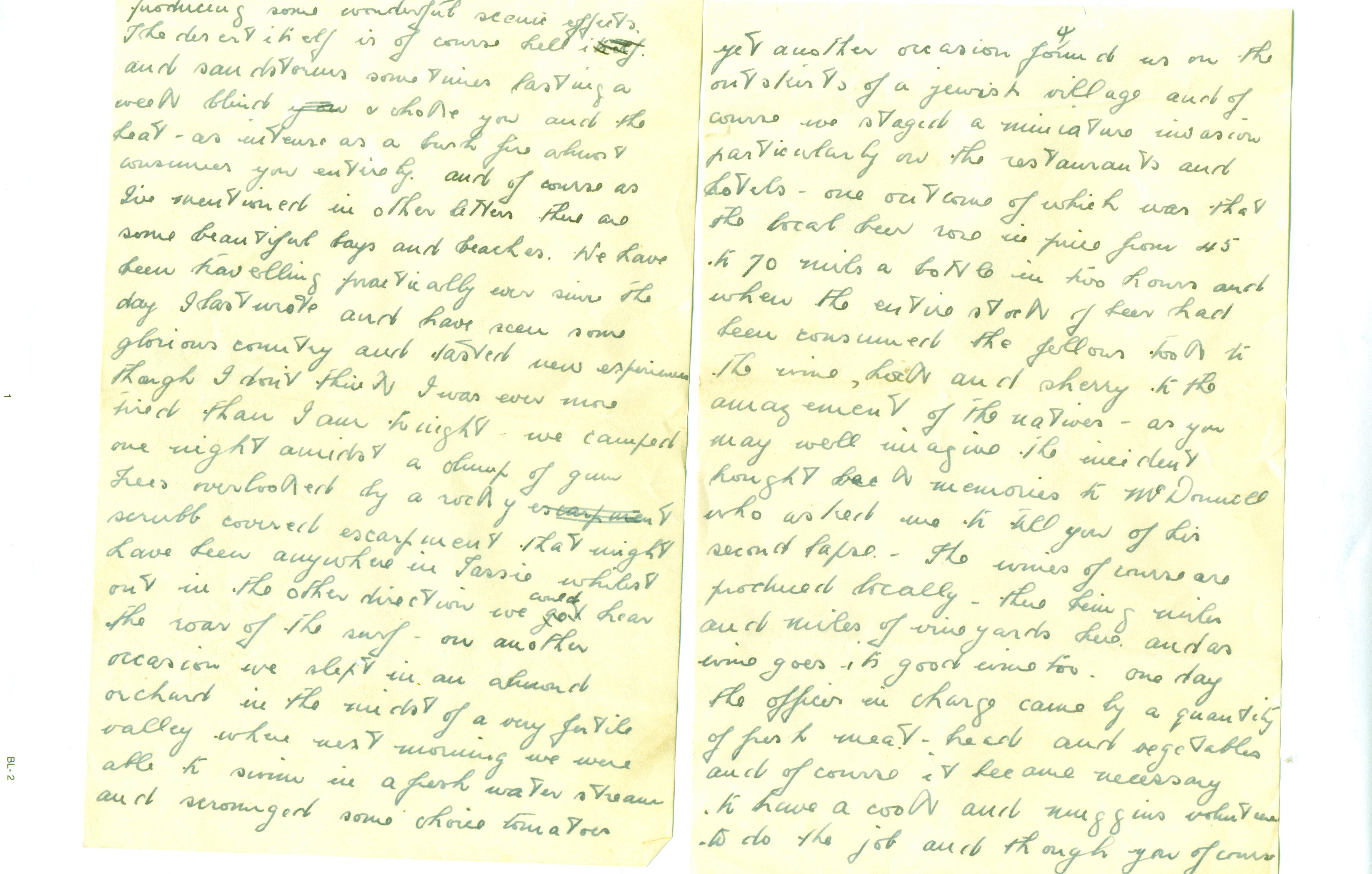 We have been travelling practically ever since the day I last wrote and have seen some glorious country and tasted new experiences though I don’t think I was ever more tired than I am tonight. We camped one night amidst a clump of gum trees overlooked by a rocky, scrub-covered escarpment that might have been anywhere in Tassie, whilst out in the other direction we could hear the roar of the surf. On another occasion we slept in an almond orchard in the midst of a very fertile valley where next morning we were able to swim in a fresh water stream and scrounged some choice tomatoes. Yet another occasion found us on the outskirts of a Jewish village and of course we staged a miniature invasion particularly on the restaurants and hotels – one outcome of which was that the local beer rose in price from 45 to 70 mils a bottle in two hours and when the entire stock of beer had been consumed the fellows took to the wine, hock and sherry to the amazement of the natives. As you may well imagine the incident brought back memories to McDonnell who asked me to tell you of his second lapse. The wines of course are produced locally – there being miles and miles of vineyards here, and as wine goes it’s good wine too.