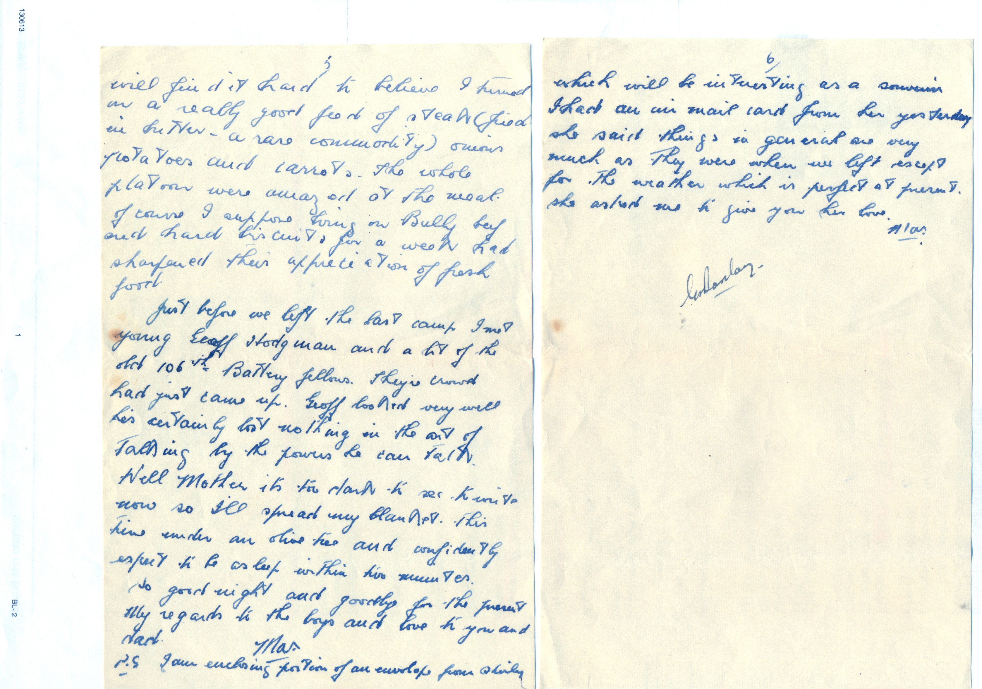 Well Mother it’s too dark to see to write now so I’ll spread my blanket – this time under an olive tree – and confidently expect to be asleep within two minutes. So good night and goodbye for the present. My regards to the boys and love to you and dad.
