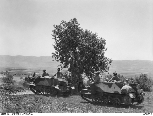 AWM 008210 June 10 1941 Bren Carrier section of the 2/33 Battalion crossing a small stream that runs through the fields near the Jewish settlement at Dan.