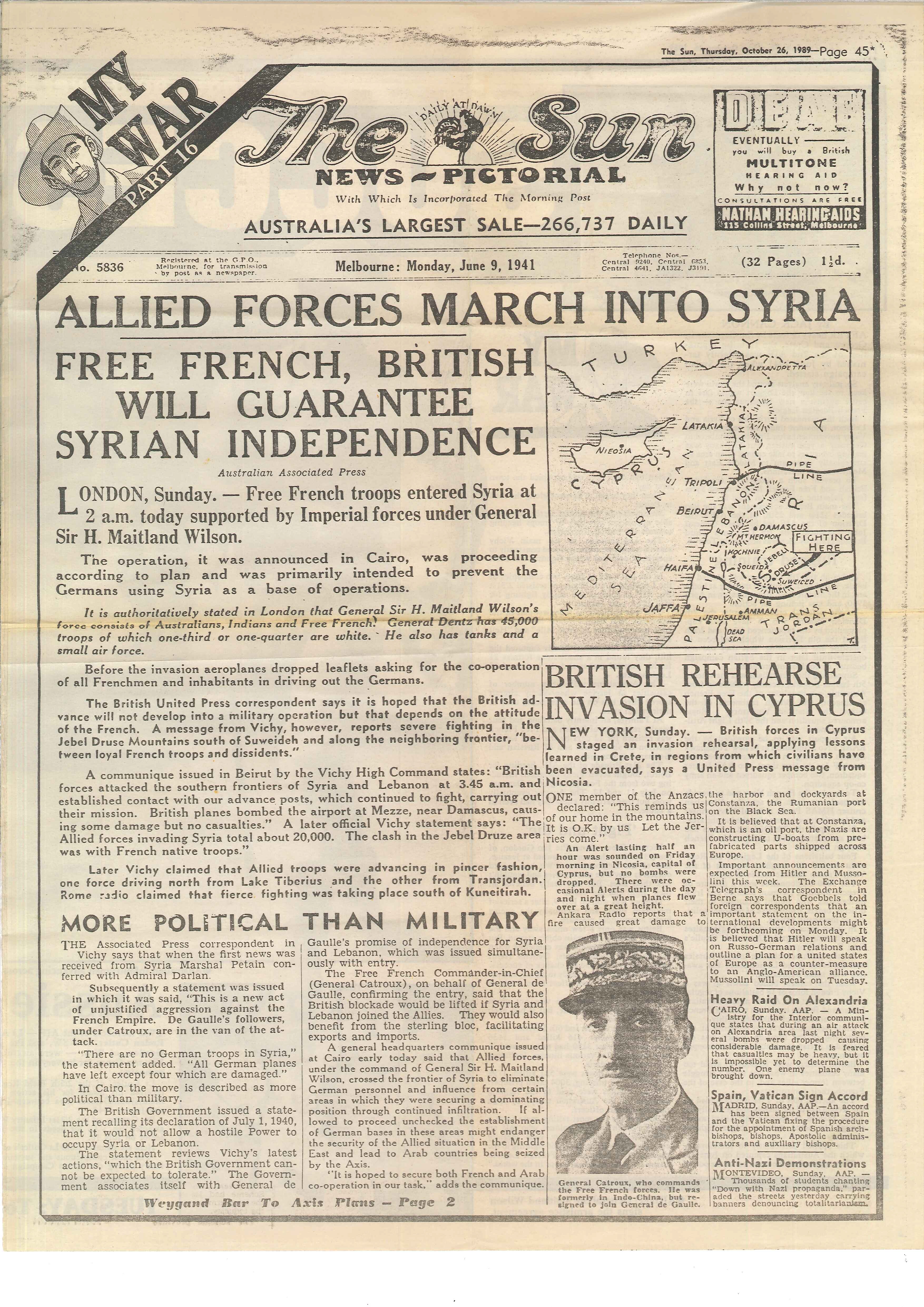 As this replica newspaper front page demonstrates, the Australian public knew the AIF was involved in the Syria campaign, but just as with the troops themselves, the public were being told that there was ‘hope that the British advance will not develop into a military operation’. As indicated in the previous post (start of the Syria campaign) this hope was ill-founded.