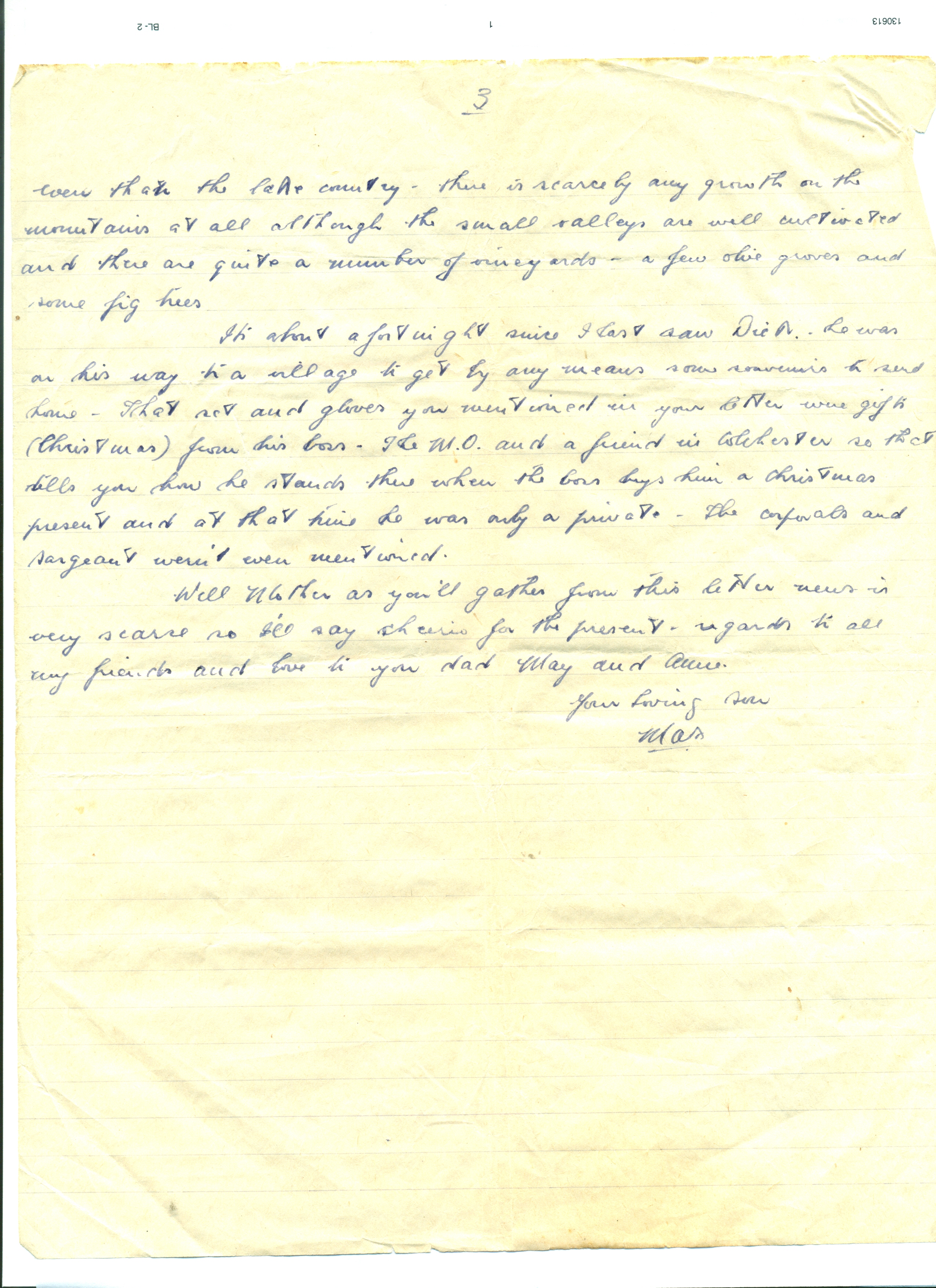 Well Mother as you’ll gather from this letter news is very scarce so I’ll say cheerio for the present – regards to all my friends and love to you, dad, May and Anne.
