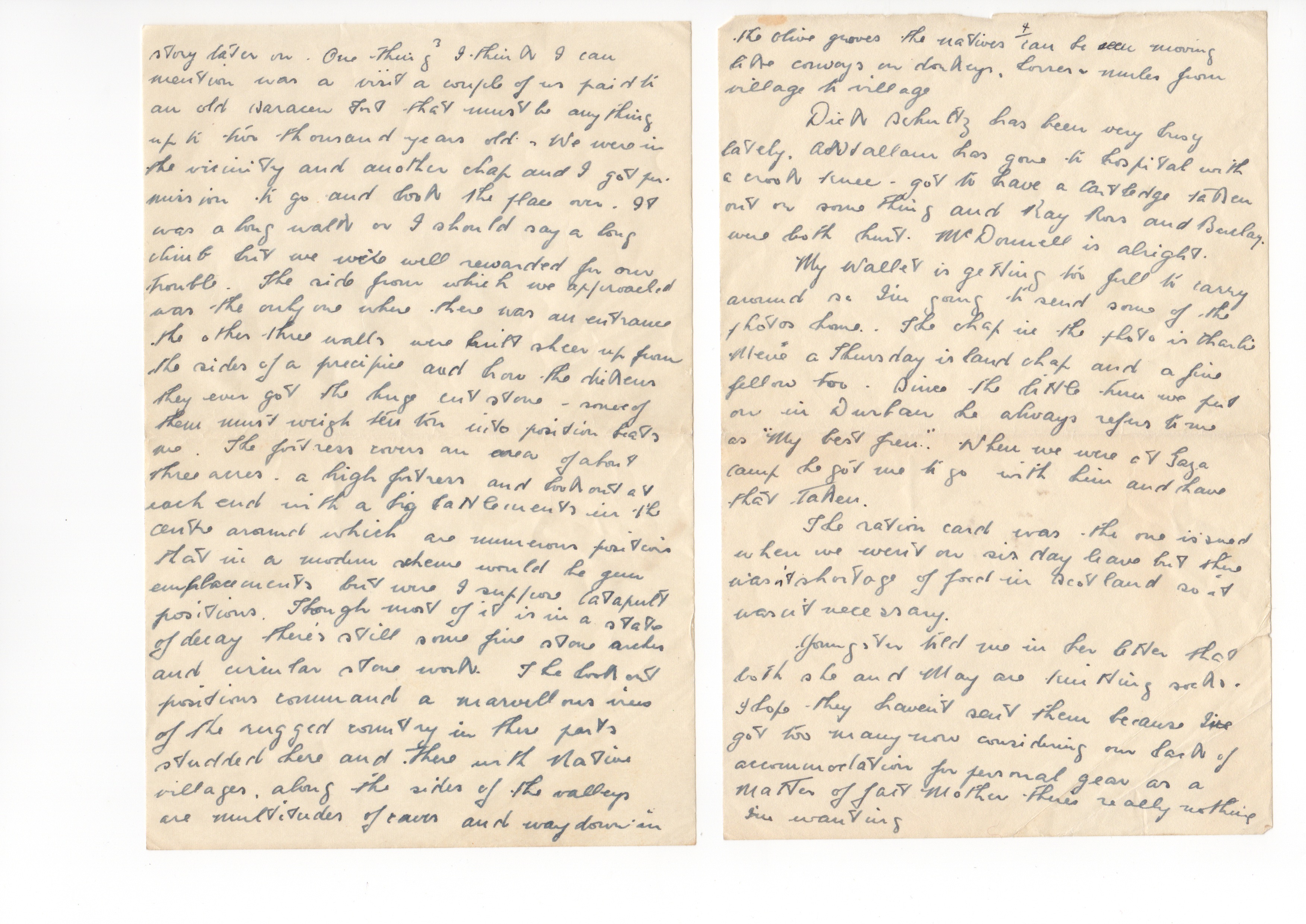 Though you may know more of our doings than we do, I’m not permitted to write you of our whereabouts or doings at present and may be able to tell you the story later on. One thing I think I can mention was a visit a couple of us paid to an old Saracen fort that must be anything up to two thousand years old. We were in the vicinity and another chap and I got permission to go and look the place over. It was a long walk or should I say a long climb but we were well rewarded for our trouble. The side from which we approached was the only one where there was an entrance. The other three walls were built sheer up from the sides of a precipice and how the dickens they ever got the huge cut stone – some of them must weigh ten tons – into position, beats me. The fortress covers an area of about three acres – a high fortress and lookout at each end with a big battlements in the centre around which are numerous positions that in a modern scheme would be gun emplacements but were I suppose catapult positions. Though most of it is in a state of decay there’s still some fine stone arches and circular stone work. The lookout positions command a marvellous view of the rugged country in these parts studded here and there with native villages, along the sides of the valleys are multitudes of caves and way down in the olive groves the natives can be seen moving like convoys on donkeys, horses & mules from village to village.
