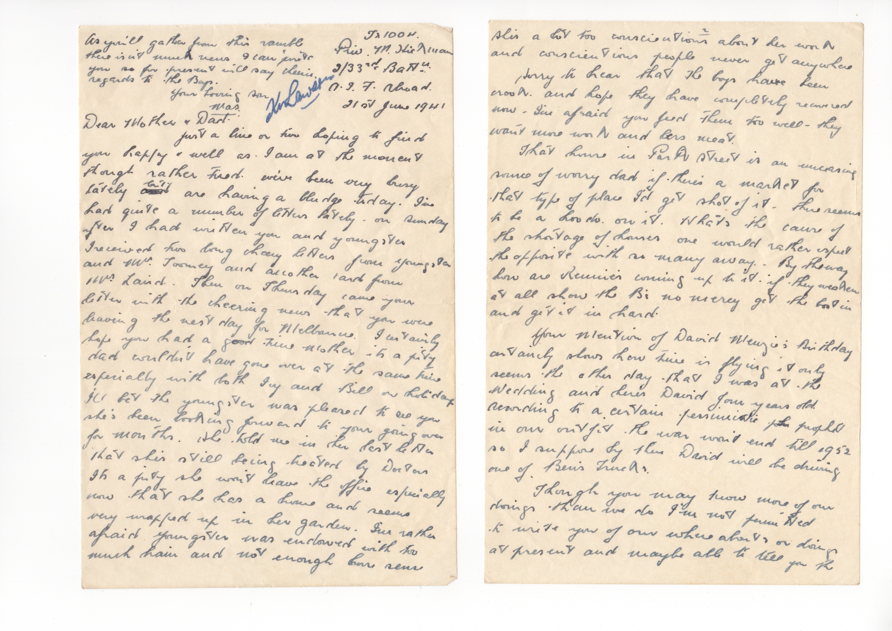 (final para written on page 1) – As you’ll gather from this ramble there isn’t much news I can write you so for present will say cheerio. Regards to the Boys.