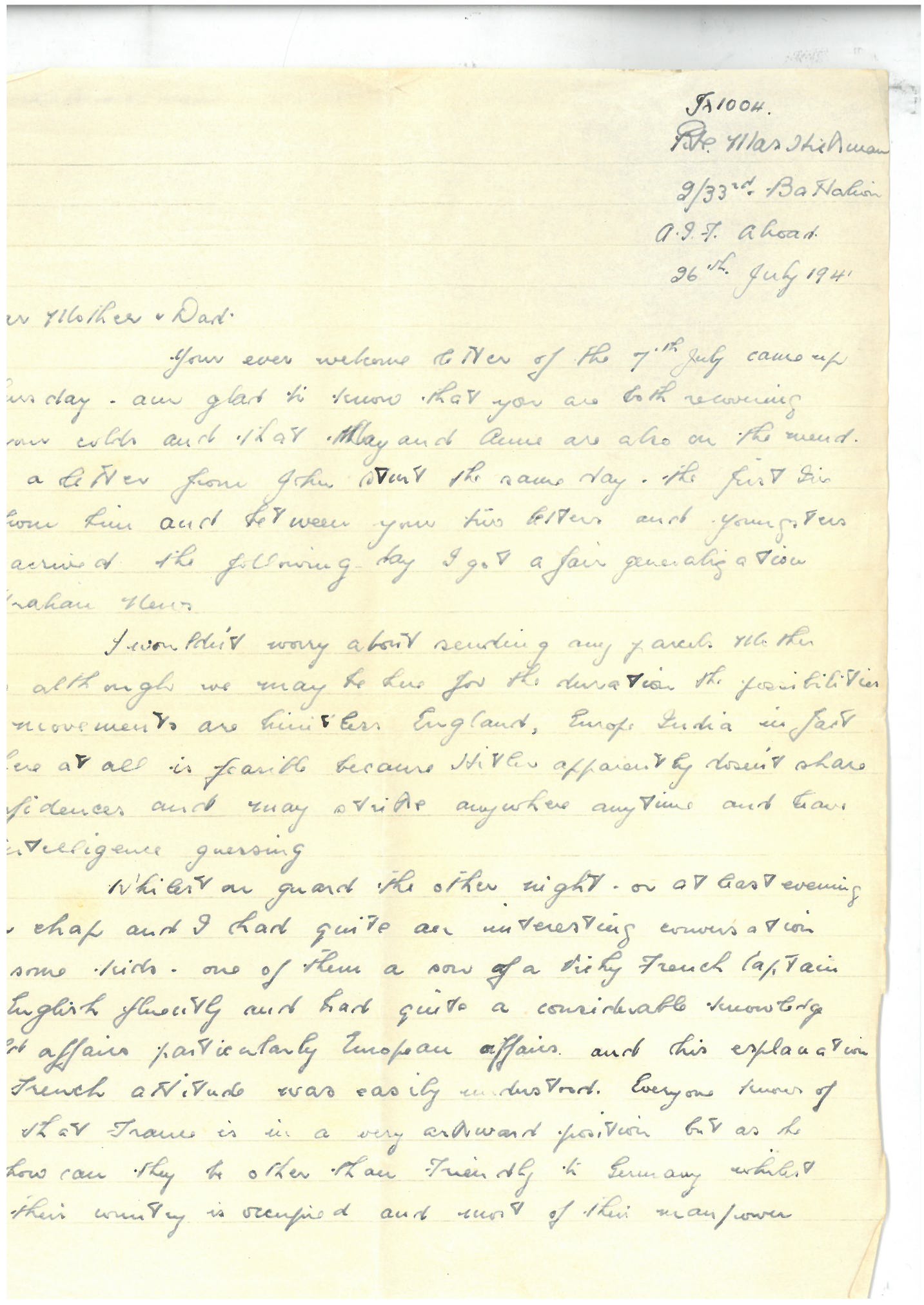 I wouldn’t worry about sending any parcels Mother because although we may be here for the duration the possibilities of our movements are limitless – England, Europe, India – in fact anywhere at all is feasible because Hitler apparently doesn’t share his confidences and may strike anywhere, anytime and leaves our intelligence guessing.
