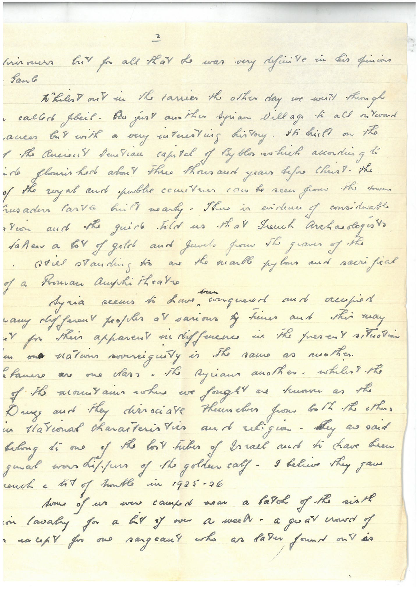 Syria seems to have ben conquered and occupied by many different people at various times and this may account for their apparent indifference in the present situation. To them one nation’s sovereignty is the same as another. The Lebanese are one class – the Syrians another – whilst the people of the mountains where we fought are known as the Jebel Druze and they dissociate themselves from both the others both in national characteristics and religion. They are said to belong to one of the lost tribes of Israel and to have been the original worshippers of the golden calf. I believe they gave the French a lot of trouble in 1925-26.