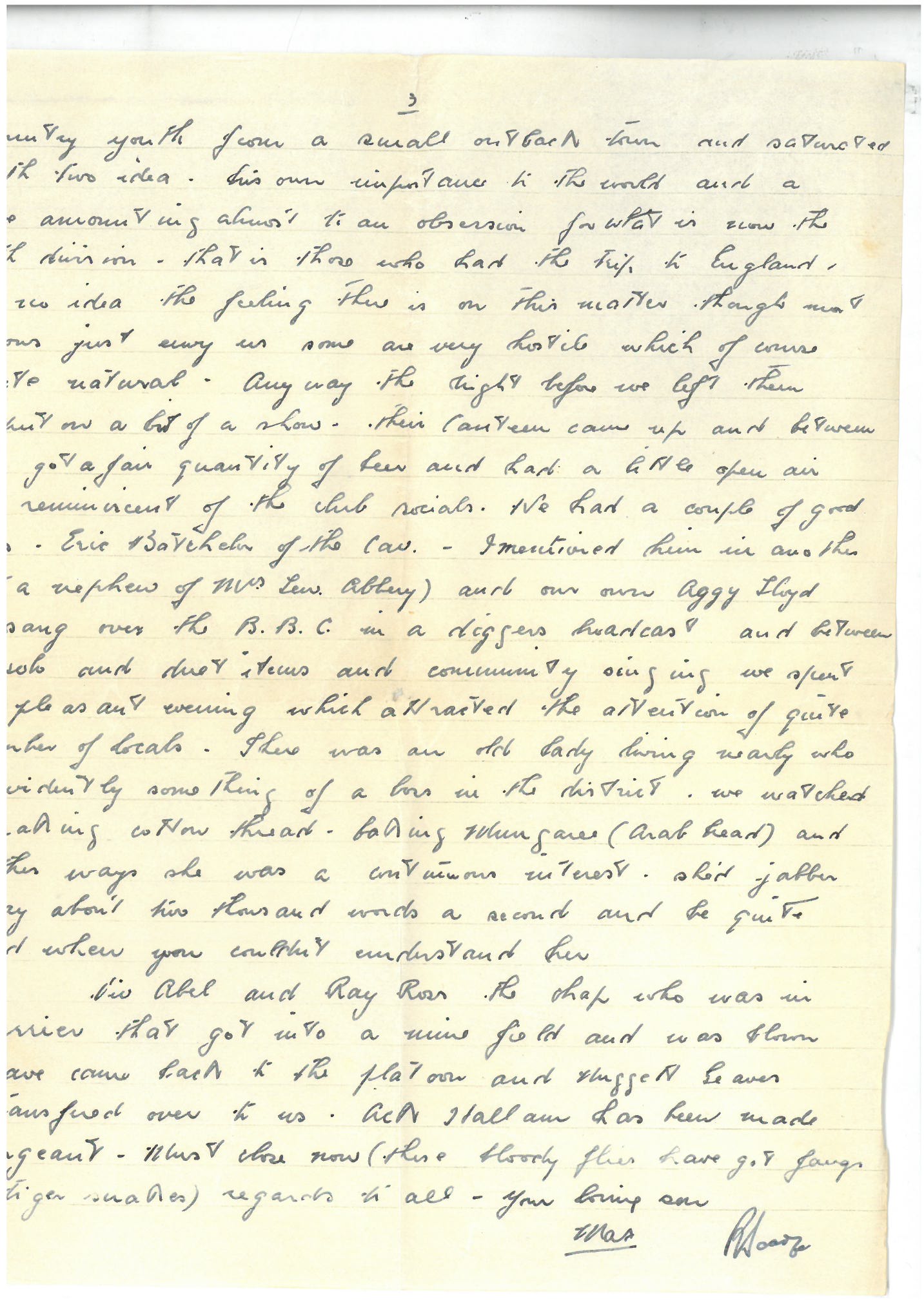 Some of us were camped near a batch of the sixth division cavalry for a bit over a week – a great crowd of fellows except for one sergeant who as I later found out is a country youth from a small outback town and saturated with two ideas – his own importance to the world and a dislike amounting almost to an obsession for what is now the seventh division – that is those who had the trip to England. You’ve no idea the feeling there is on this matter – though most fellows just envy us some are very hostile which of course is quite natural. Anyway the night before we left them they put on a bit of a show. Their canteen came up and between us we got a fair quantity of beer and had a little open air party reminiscent of the club socials. We had a couple of good singers – Eric Batchelor of the Cav – I mentioned him in another letter (a nephew of Mrs Lew Abbery) and our own Aggy Lloyd who sang over the BBC in a diggers broadcast- and between their solo and duet items and community singing we spent a very pleasant evening which attracted the attention of quite a number of locals. There was an old lady living nearby who was evidently something of a boss in the district. We watched her making cotton thread, baking Mungaree (Arab bread) and in other ways she was a continuous interest. She’d jabber away about two thousand words a second and be quite annoyed when you couldn’t understand her.