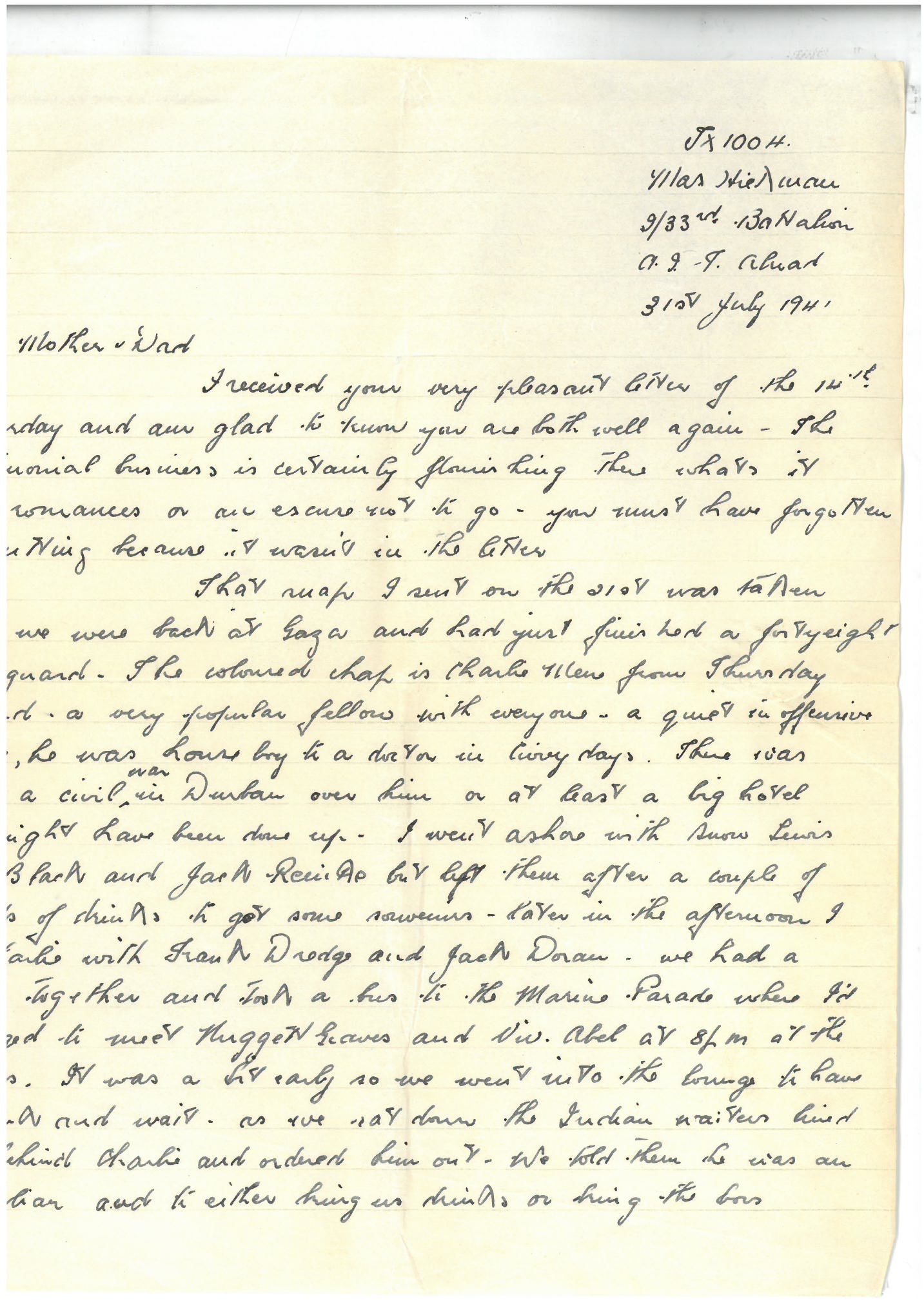That snap I sent on the 21st was taken when we were back at Gaza and had just finished a forty eight hour guard. The coloured chap is Charlie Mene from Thursday Island – a very popular fellow with everyone – quiet, inoffensive fellow, he was a house boy to a doctor in civvy days. There was nearly a civil war in Durban over him, or at least a big hotel might have been done up. I went ashore with Snow Lewis, John Black and Jack Reinke but left them after a couple of rounds of drinks to get some souvenirs. Later in the afternoon I met Charlie with Frank Dredge and Jack Doran. We had a snack together and took a but to the Marine Parade where I’d arranged to meet Nuggett Geeves and Viv Abel at 8pm at the Empress. It was a bit early so we went into the lounge to have a drink and wait. As we sat down the Indian waiters lined up behind Charlie and ordered him out. We told them he was an Australian and to either bring us the drinks or bring the boss. We only had one drink and left with the idea of going to the baths for a swim and coming back later however we were refused admission both to the baths and an amusement park – by which time Charlie was white with rage and would have gone back to the boat but the others stopped him. We decided we would go back to a less aristocratic section of the city and as we passed the Empress I called in to tell Nuggett. The drinking public were settling down by this time and the lounge was full. Though I couldn’t see Nuggettt (he was in the bar with McDonnell and Viv) there were a lot of other Aussies there and several of them asked me to have a drink so like a mug I called the others in. From the time we sat down all eyes were focussed on Charlie. I think I told you of the colour bar – and some of our fellows were getting niggerly about it and when they’ve got a drop in and things go wrong something gets done up and it looked like trouble so when Charlie went outside I send Frank Dredge to keep him out for a while and then made a little speech and told them that we appreciated their domestic problems but as we didn’t have the same trouble Charlie was one of ourselves and we’d like them to give him a fair go. The crowd took it very well too – they gave me a hand and from then on we didn’t have to buy any beer and when leaving the manageress invited us to go back next day.